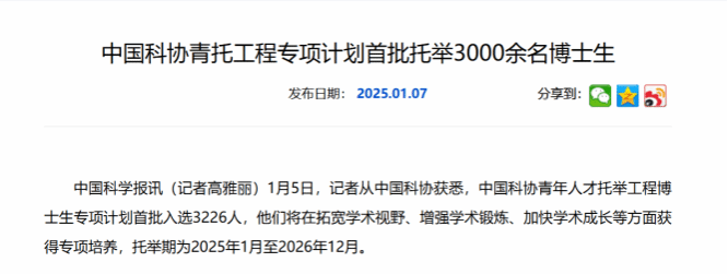 为深入贯彻党的二十大和二十届二中、三中全会精神,落实全国科技大会精神,聚焦实现高水平科技自立自强目标,完善青年创新人才发现、选拔、培养机制,促进青年科技人才成长,中国科协在2024年首次启动实施面向博士生科技创新人才的托举专项计划,旨在帮助具有潜力的高年级在读博士生“破土发芽”。