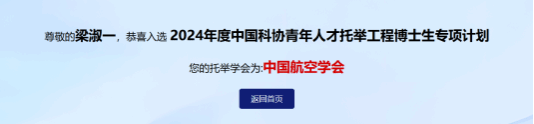 近日,中国科协办公厅正式公布了2024年度中国科协青年人才托举工程博士生专项计划(首批)的评选结果。力学与土木建筑学院2022级力学专业博士生梁淑一经过层层评选,脱颖而出,成功入选该计划,托举学会为中国航空学会。