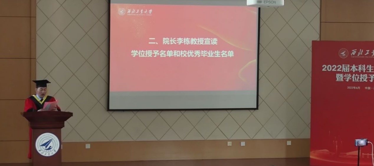 院长李栋教授宣读学位授予名单和校优秀毕业生名单,党委书记巨维博颁发优秀毕业生证书和奖品。
