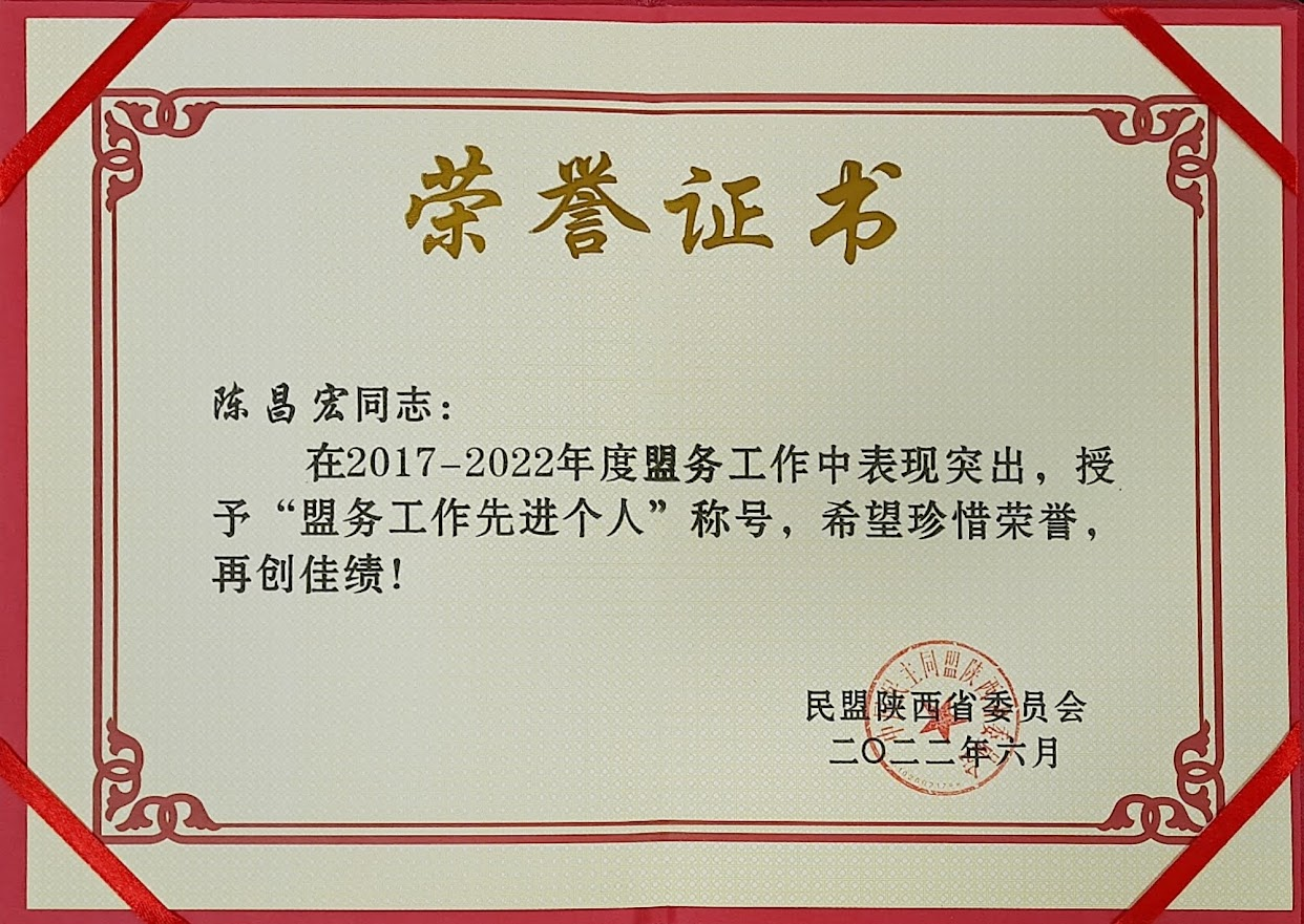 6月23日,民盟陕西省十二届七次全委会在西安召开,会议对民盟陕西省委2017-2022年度盟务工作先进集体和先进个人进行了表彰。力学与土木建筑学院土木工程系副教授陈昌宏获2017-2022年度盟务工作先进个人。