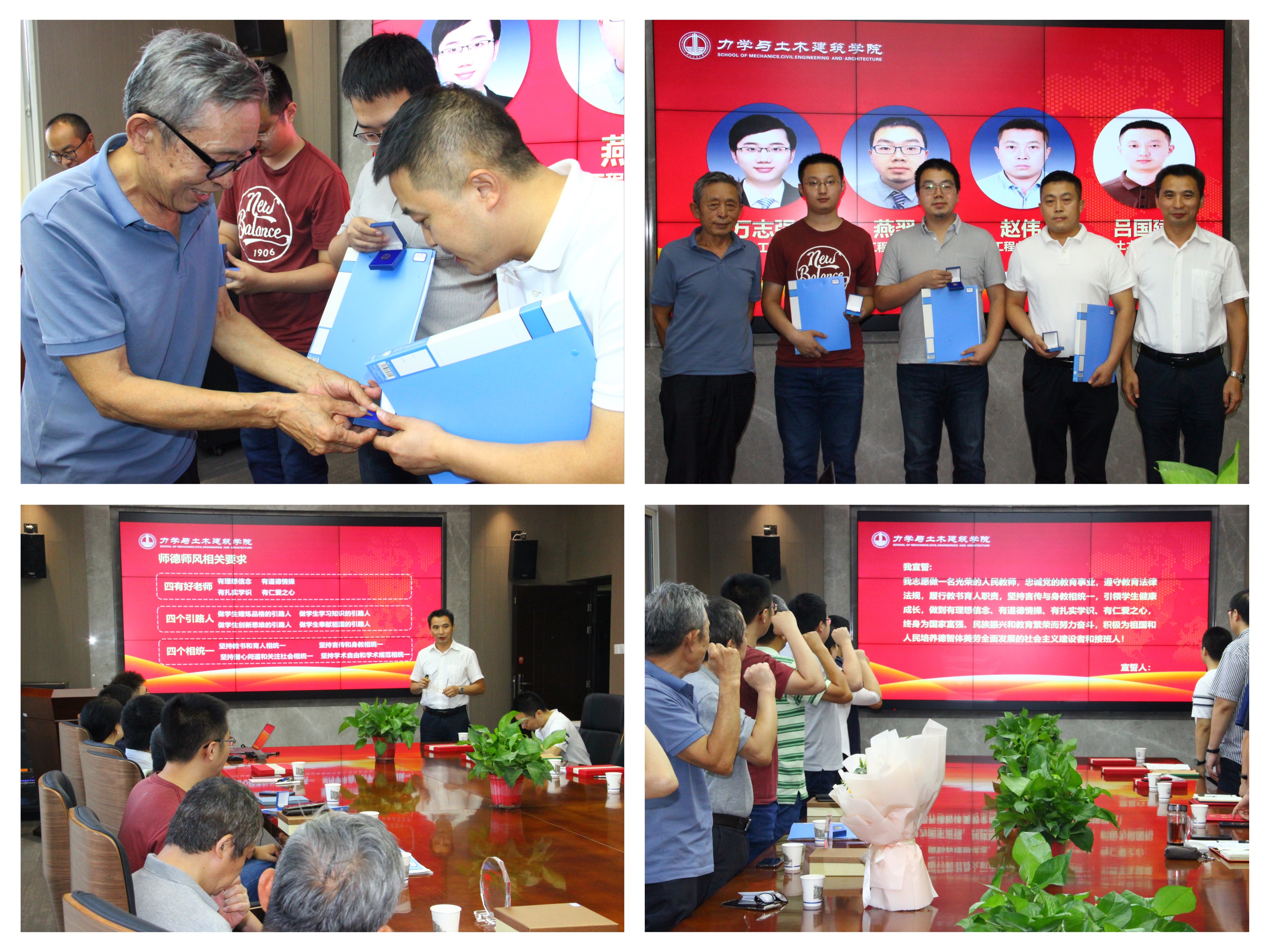 接下来,学院为新进教师举行了入职仪式,通过为新进教师颁发任务书,由学院退休教师代表闫云聚老师为新进教师佩戴代表传承的院徽,与新进教师签订师德师风责任书,开展新进教师入职宣誓,进一步强化青年教师责任担当,持续加强学院师德师风建设。闫云聚老师鼓励新进教师要勇担教书育人的使命,肩负起高校教师的责任与义务,持续不断精益求精,为国家培养人才努力奋斗。青年教师表示将不负学院和教育前辈们的重托,努力提升自身教学科研实力,以立德树人为己任,坚持“四个相统一”,成为“四有好老师”,争做学生成长成才路上的“四个引路人”。巨维博书记还围绕《新时代高校教师职业行为十项准则》《高校教师师德禁行行为“红七条”》和师德师风警示教育案例等内容进行了专题培训。