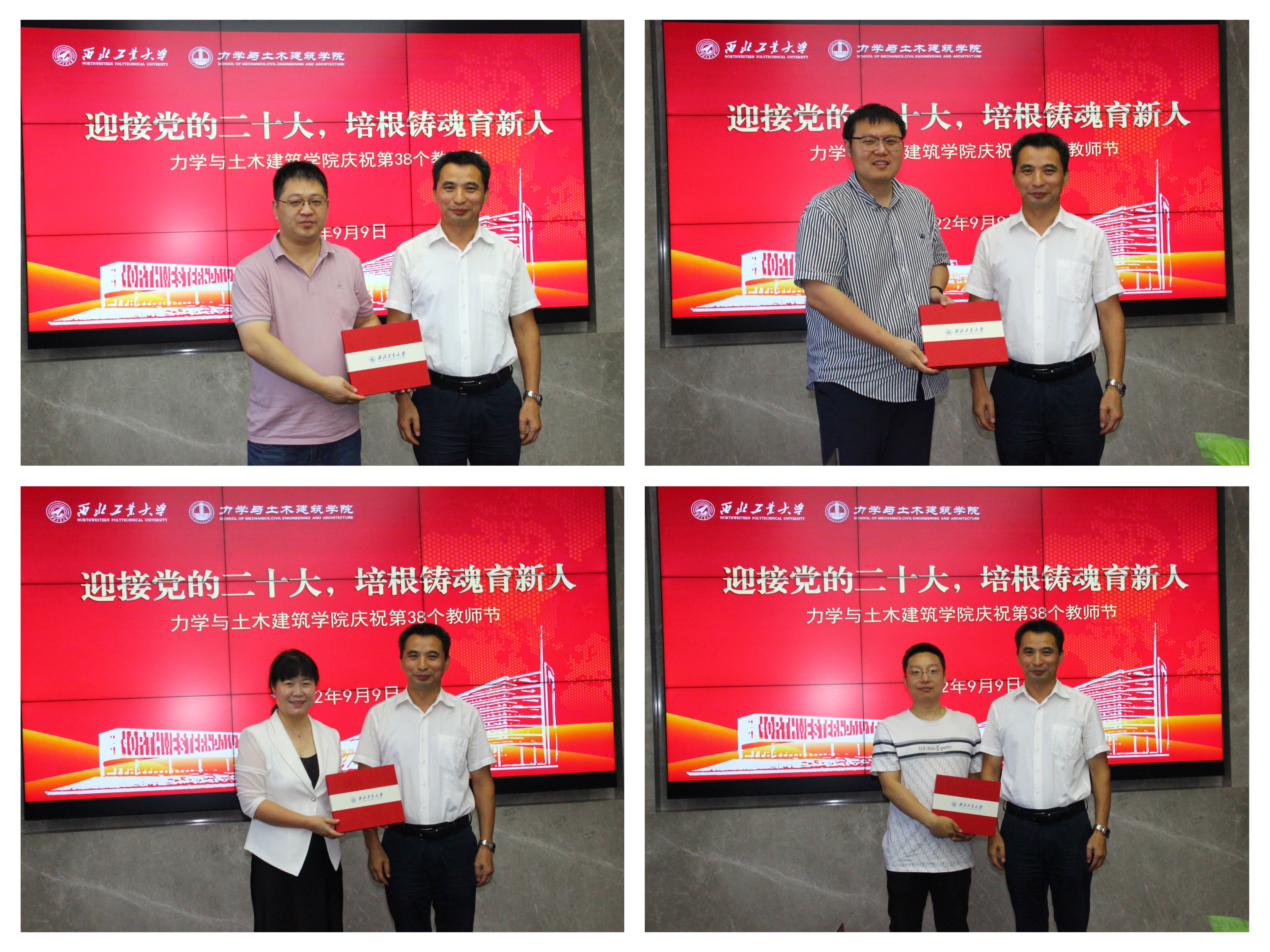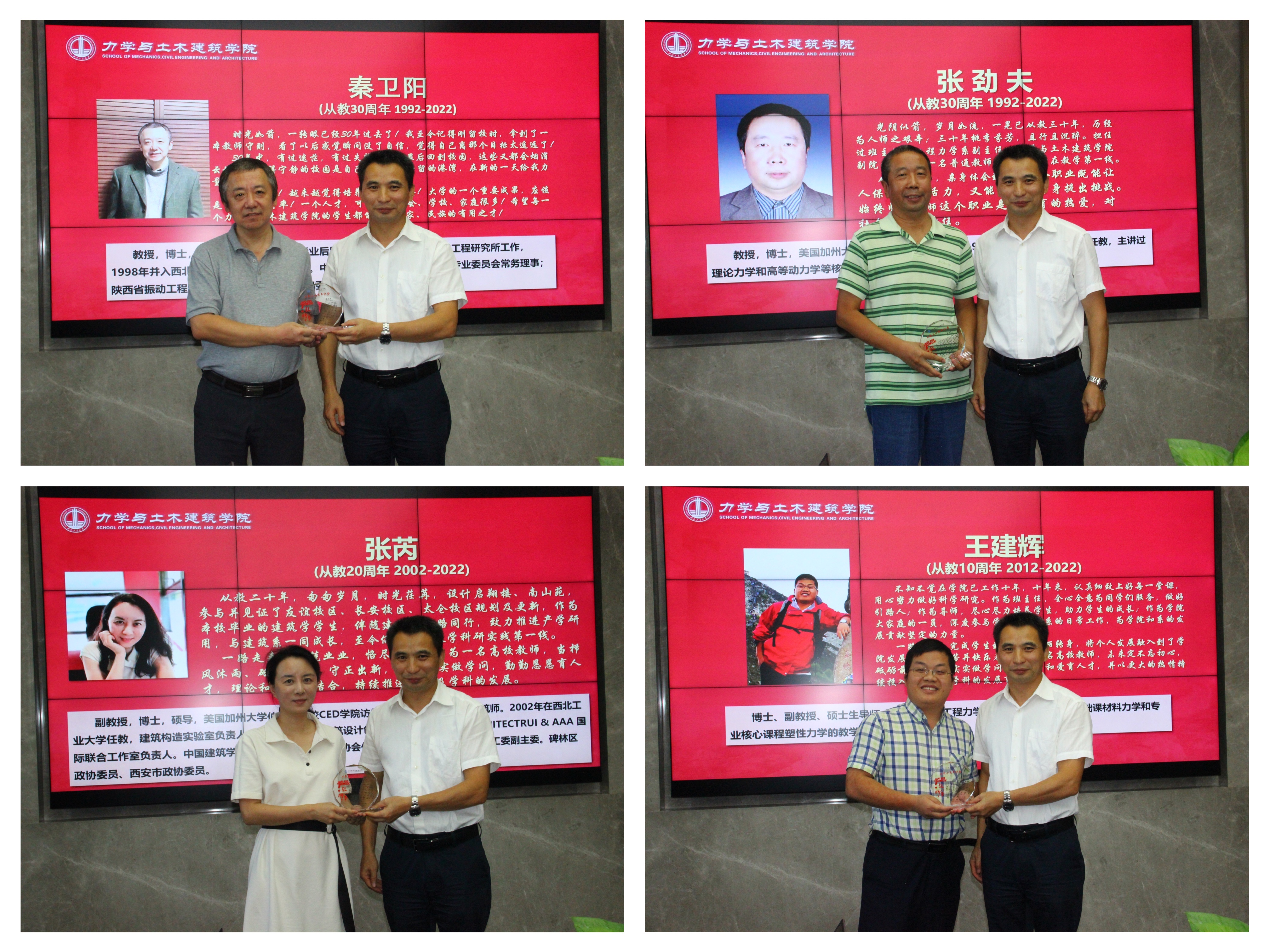 在今年学院有4位老师迎来了从教整周年,秦卫阳老师、张劲夫老师入校教书育人已有30年,为学院人才培养、课程建设和科学研究奠定了坚实的基础。张芮老师从教20周年与建筑系一同成长,推进产学研用,在友谊校区、长安校区、太仓校区建设规划中展现了建筑学的力量。王建辉老师从教10周年,在育人的同时深度参与学院日常管理工作,迎来了学生到老师的华丽转身。学院为4位老师准备了纪念水晶,深切表达了对4位老师的衷心感谢。