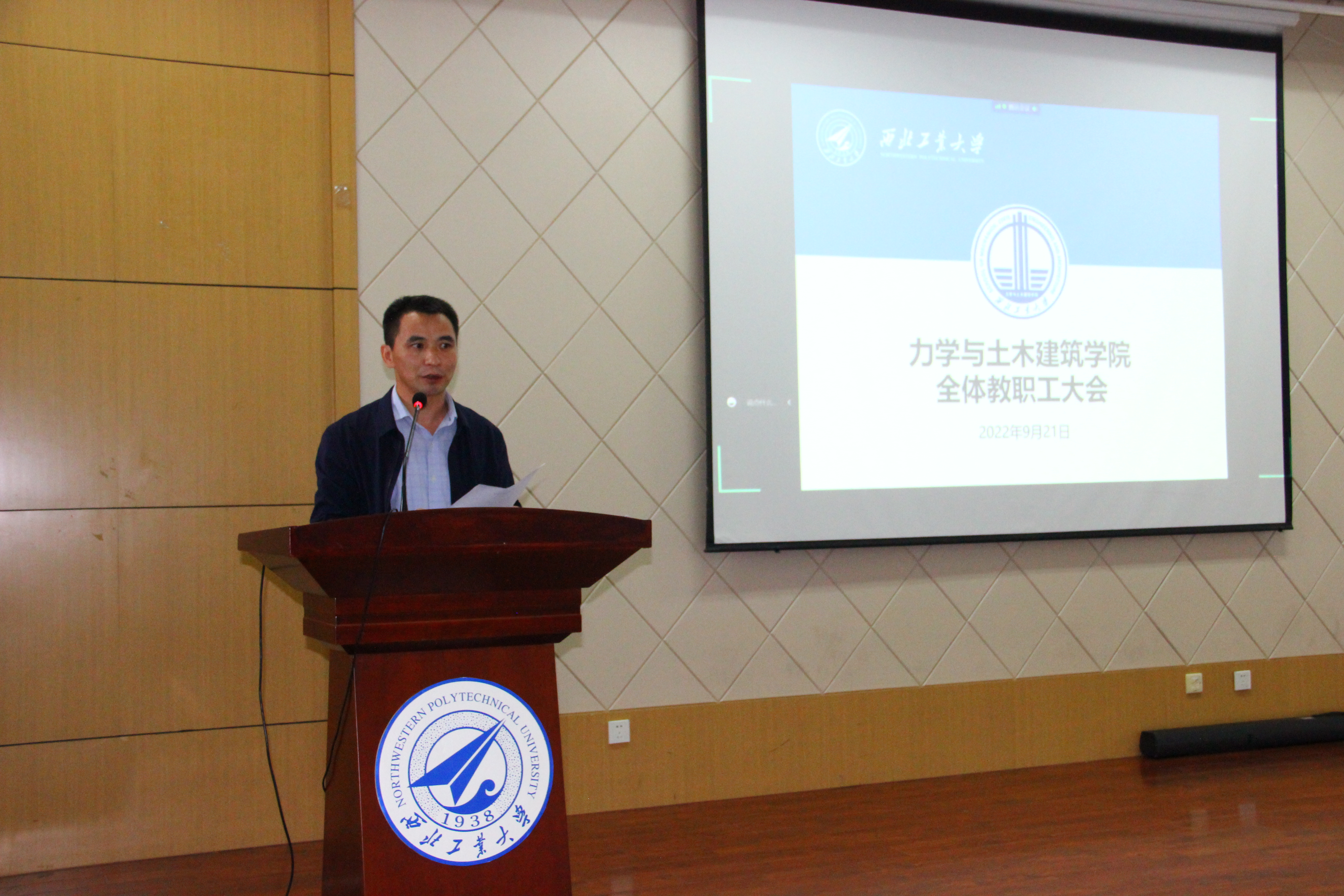 9月21日下午,力学与土木建筑学院召开全院教职工大会,对学校新学期干部大会精神进行了传达,对学院新学期重点工作进行了安排部署并对学院推进学校“四个行动计划”情况进行汇报。应疫情防控要求,本次会议设置一个主会场和两个分会场,学院班子成员和全体教职工参加了会议,本次会议由学院党委书记巨维博主持。
