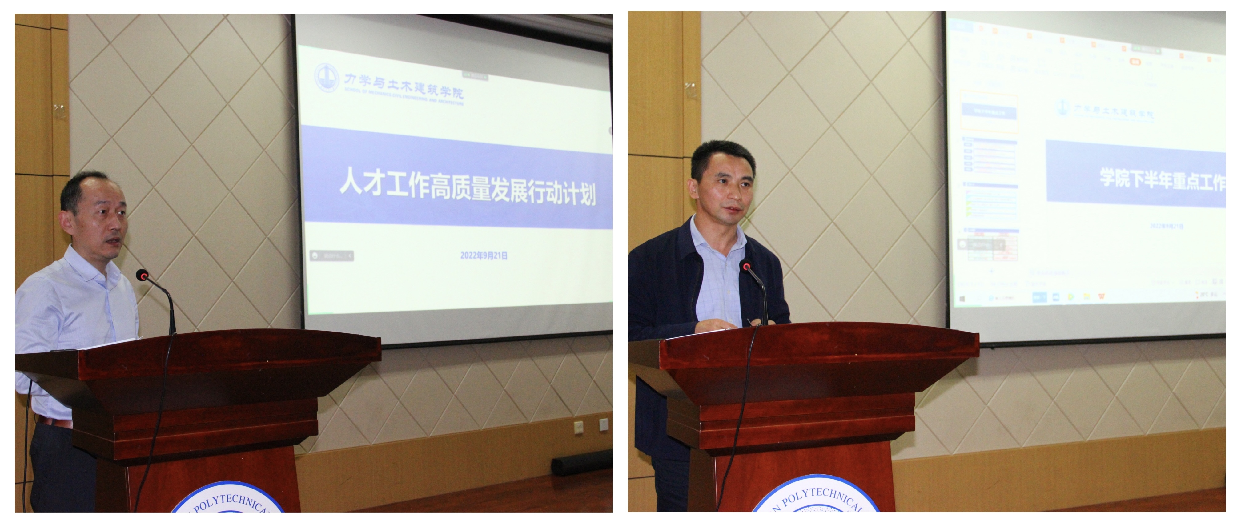 院长李栋对学校《人才工作高质量发展行动计划》进行了宣贯,并对学院人才工作改革举措和下一阶段行动计划进行了汇报、提出学院要以打造一流人才队伍为根本任务,按照思想铸魂“引领人”,引育并举“集聚人”,措施集成“激励人”,改革赋能“助力人”,资源整合“服务人”的改革思路,盘活学院资源,破解制约人才发展的体制机制障碍,全方位培养、引进、用好人才,为推进学院发展,实现高水平科技自立自强提供强有力的人才支撑。随后还对学院迎接本科教育教学审核评估工作进行了动员。