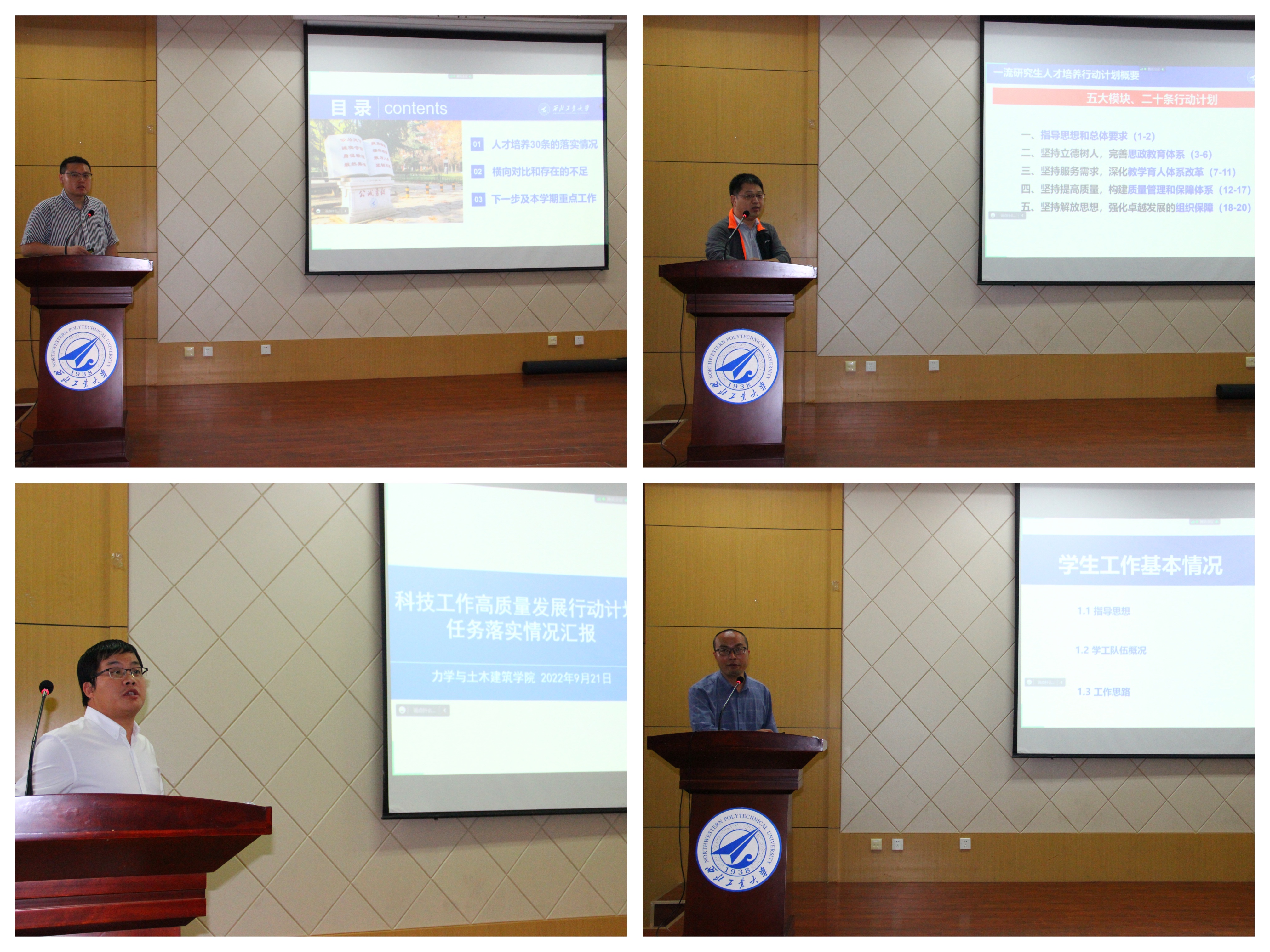 副院长李磊汇报了学院《一流研究生人才培养行动计划》落实情况,提出针对研究生培养学院将围绕力学、土木工程、建筑学三个学科特点和自身优势,全方位转变研究生培养理念,推进建成力学复合型人才培养体系、土木工程多学科交叉人才培养体系和建筑学特色人才培养体系,形成特色鲜明、竞争力强的研究生培养模式。