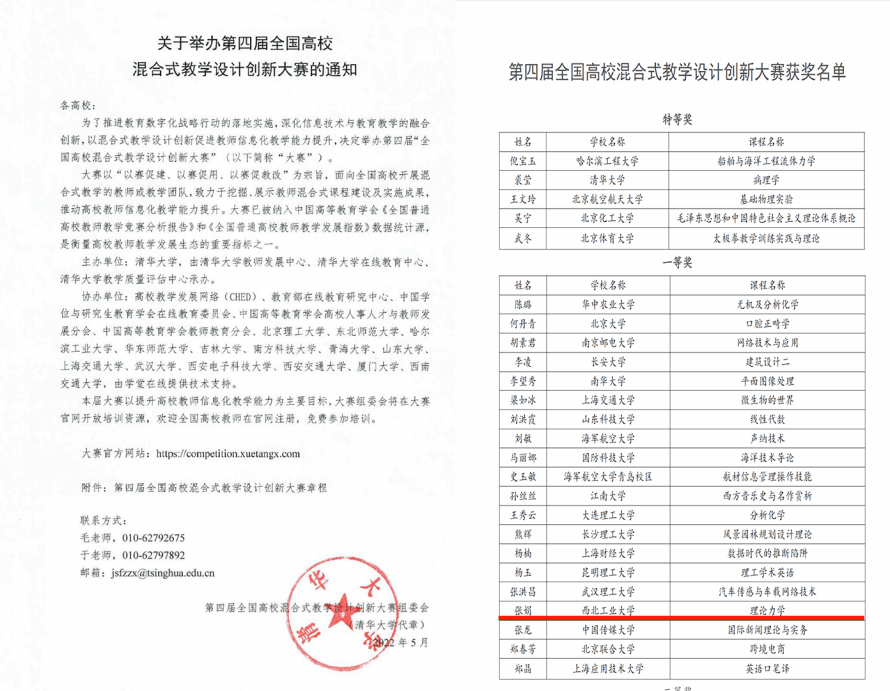 在12月份刚刚揭晓的2022年第四届全国高校混合式教学设计创新大赛中,yl6809永利集团力学与土木建筑学院张娟教授的参赛作品《理论力学》荣获一等奖!