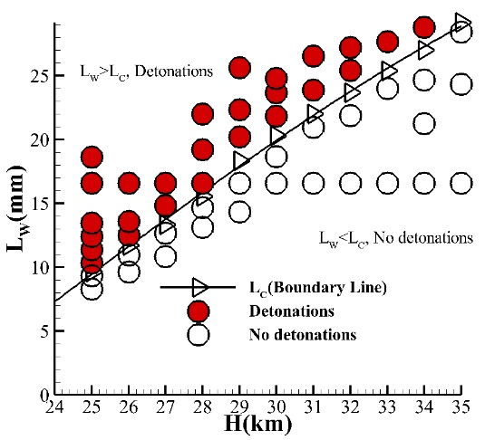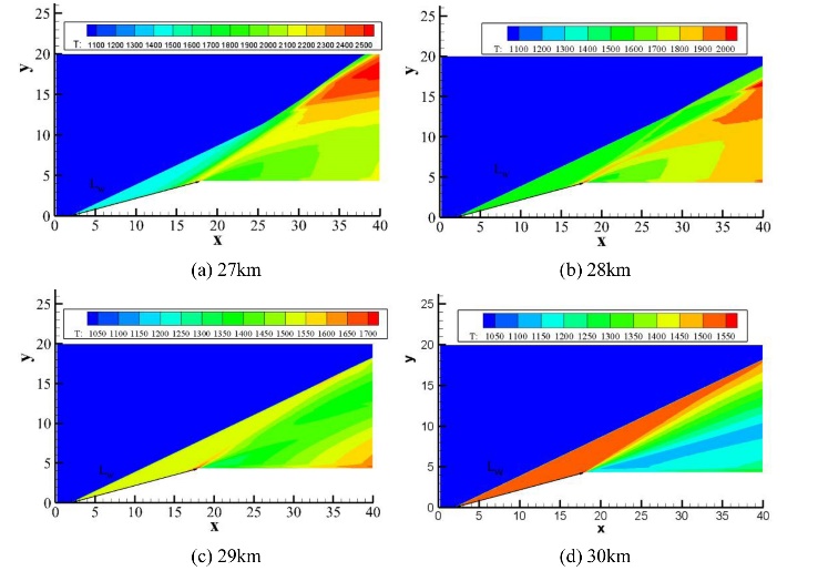 针对高空真实飞行条件下斜爆轰起爆机理,研究发现高空条件对斜爆轰起爆性能影响较大,飞行高度的增加导致了诱导区长度增加,进而导致斜爆轰不起爆。研究者提出了针对平滑型转变爆轰波结构的斜爆轰起爆准则,当爆燃波的前端汇聚点位置小于水平楔面前端位置,斜爆轰起爆,否者斜爆轰不起爆。该准则能对斜爆轰发动机起爆性能进行很好地预测,研究成果以“Investigations on oblique detonations induced by a finite wedge in high altitude”为题发表在国际顶级期刊《Aerospace Science and Technology》(Top,影响因子3.7),论文链接https://doi.org/10.1016/j.ast.2019.105451