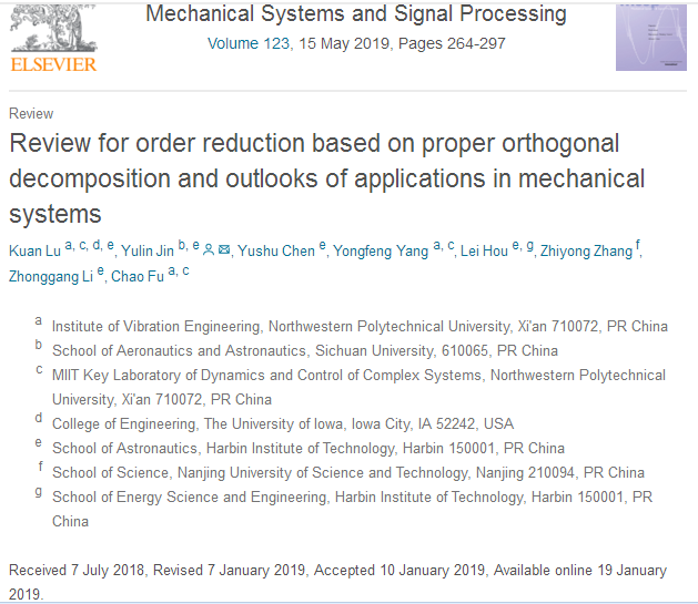 2019年1月20日,中科院1区、工程与机械领域顶级期刊《机械系统与信号处理》(Mechanical Systems and Signal Processing)在线发表了由yl6809永利集团、四川大学、哈尔滨工业大学、南京理工大学联合研究成果。在陈予恕院士的指导下,路宽副教授、F1岗辅导员(第一作者)、靳玉林讲师(通信作者)对POD方法进行长篇综述并展望了其在机械系统中的应用。此文章长度为34页,属于长篇综述。