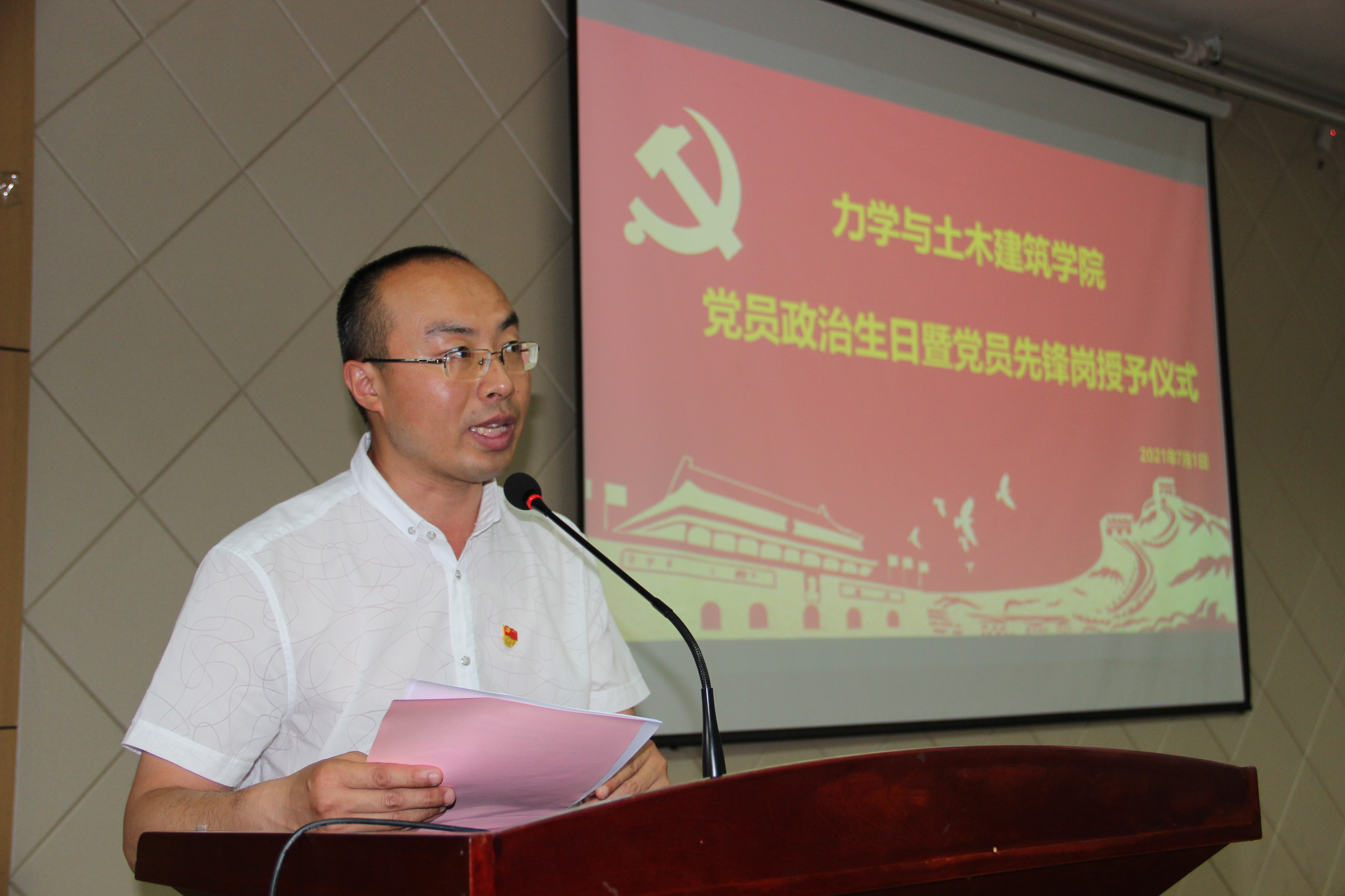 在中国共产党成立100周年之际,为进一步强化党员宗旨意识,发挥共产党员先锋模范带头作用,力学与土木建筑学院党委举行党员政治生日暨党员先锋岗授予仪式。学院党委委员、班子成员、支部书记、64名师生党员先锋岗、6、7月过政治生日师生党员参加了本次会议,党委副书记乔吉超主持会议。