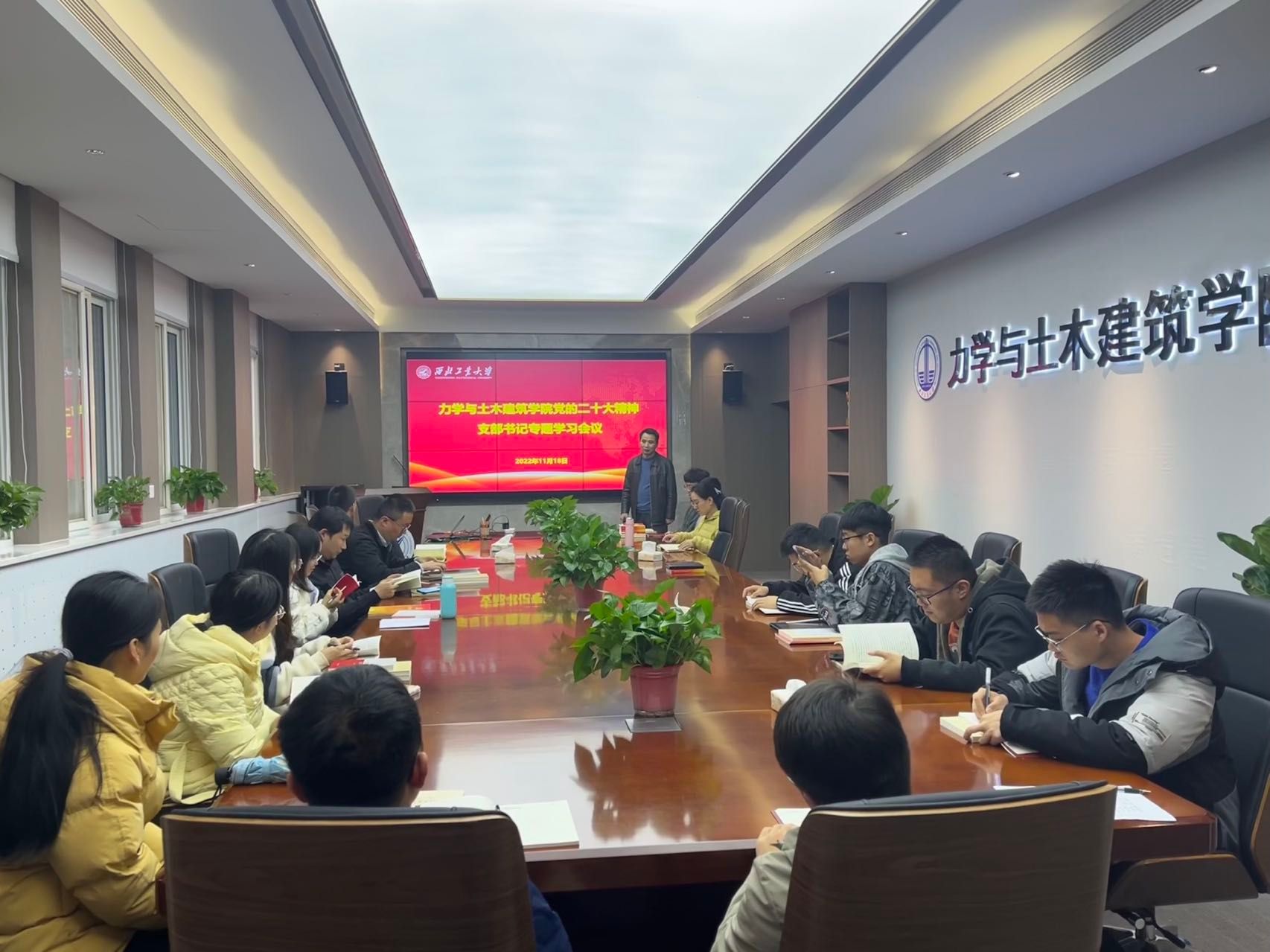 11月18日下午,力学与土木建筑学院召开了11月支部书记工作例会专题学习党的二十大精神。学院师生党支部书记、支部委员参加了会议,会议由学院党委书记巨维博主持。