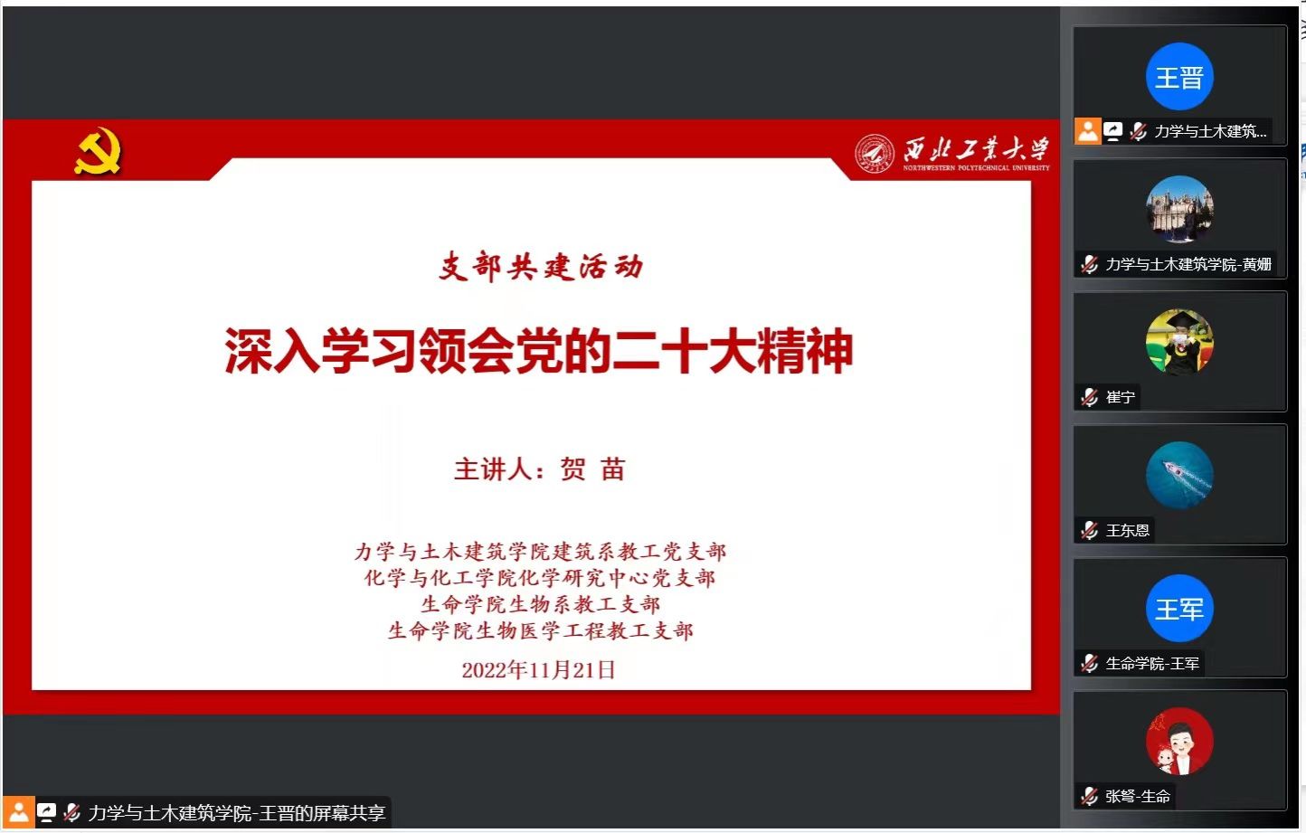 为深入宣传贯彻党的二十大精神,11月21日,力学与土木建筑学院建筑系教工党支部、化学与化工学院化学研究中心党支部、生命学院生物学系党支部和生物医学工程系党支部共同开展了主题为“深入学习领会党的二十大精神”支部手拉手创新共建活动。活动邀请了学校党的二十大精神宣讲团成员、马克思主义学院贺苗副教授开展了“深入学习党的二十大精神”的专题党课,四个支部的教师党员通过视频会议参加了本次宣讲会。