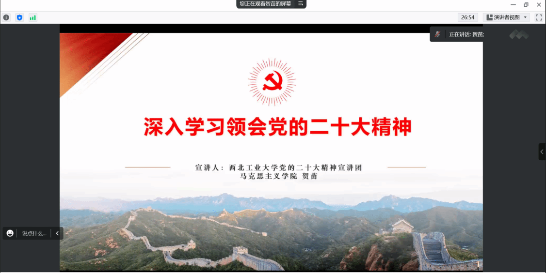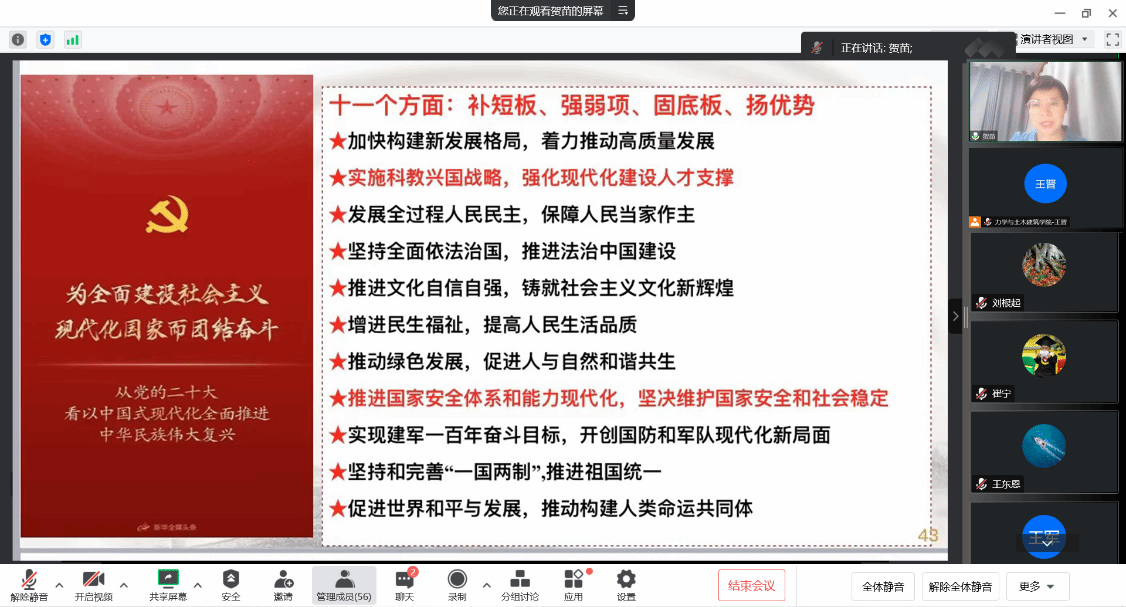 宣讲中,贺苗老师围绕“深入学习领会党的二十大精神”,紧扣党的二十大报告原文从深入学习领会党的二十大的重大意义、党的二十大主题、过去五年的工作和新时代十年伟大变革、习近平新时代中国特色社会主义思想的世界观和方法论、中国式现代化、党的二十大对未来五年党和国家各项事业发展的战略部署、以党的伟大自我革命引领伟大社会革命的重要要求、发扬斗争精神、增强斗争本领、坚持团结奋斗的时代要求等方面对党的二十大报告进行了梳理和解读。