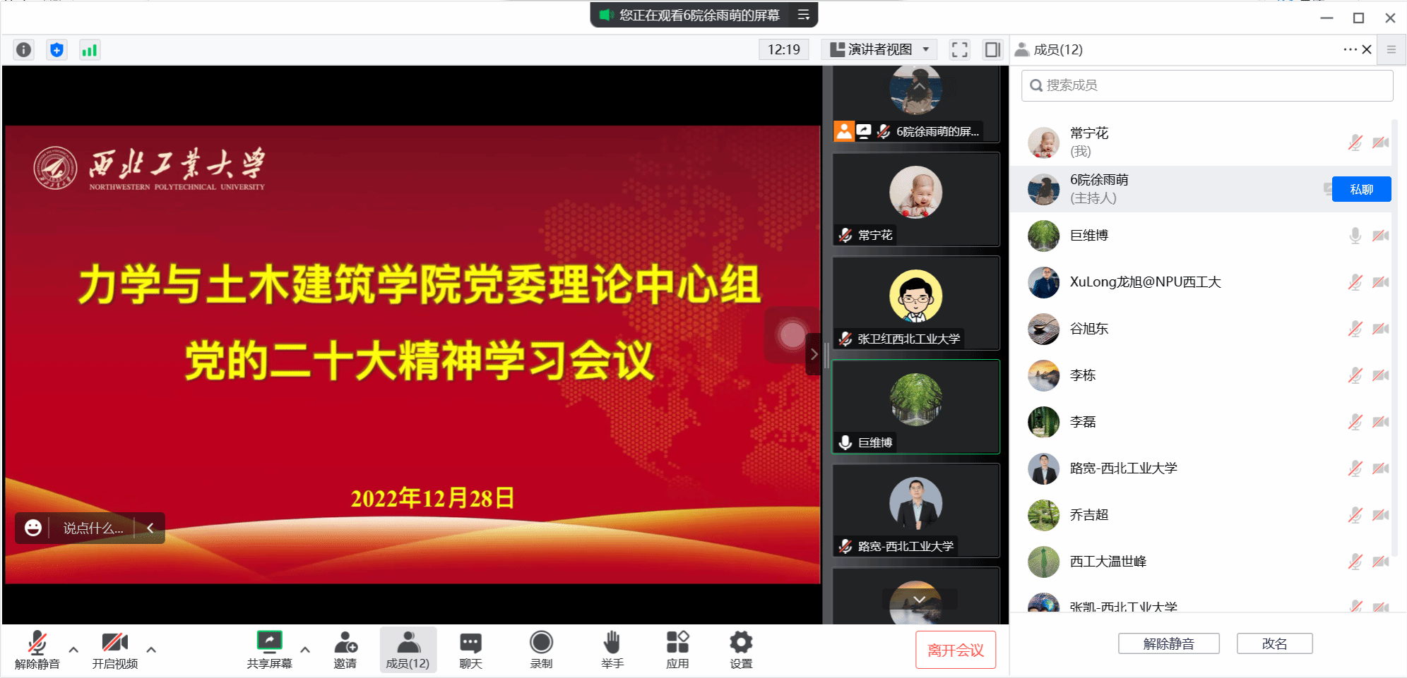 12月28日下午,力学与土木建筑学院召开党委理论中心组学习会议,会议集中学习了学校2022年警示教育大会精神,围绕党的二十大精神开展了专题研讨,并结合党的二十大精神学习成果汇报交流了学校四个行动计划落实情况以及下一步工作计划。副校长张卫红参加指导会议,学院党委理论中心组成员参加本次会议,会议由学院党委书记巨维博主持。