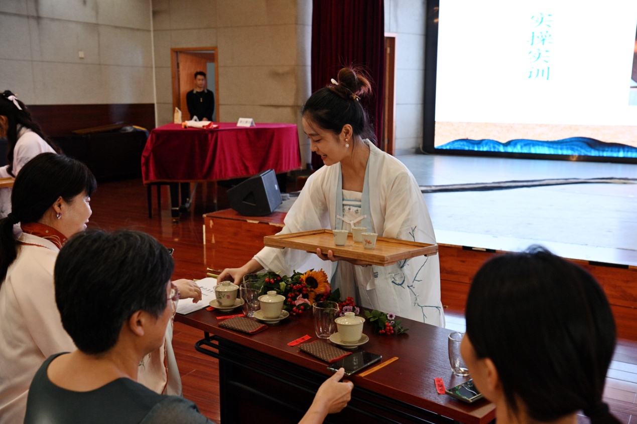 6位学生代表,身着素雅汉服,为现场的每位老师以礼敬茶。饮水思源,师恩如茶,恭敬之间,师道的传承与延续,学子的感恩与敬重,已在芬芳甘冽的茶香间体现。