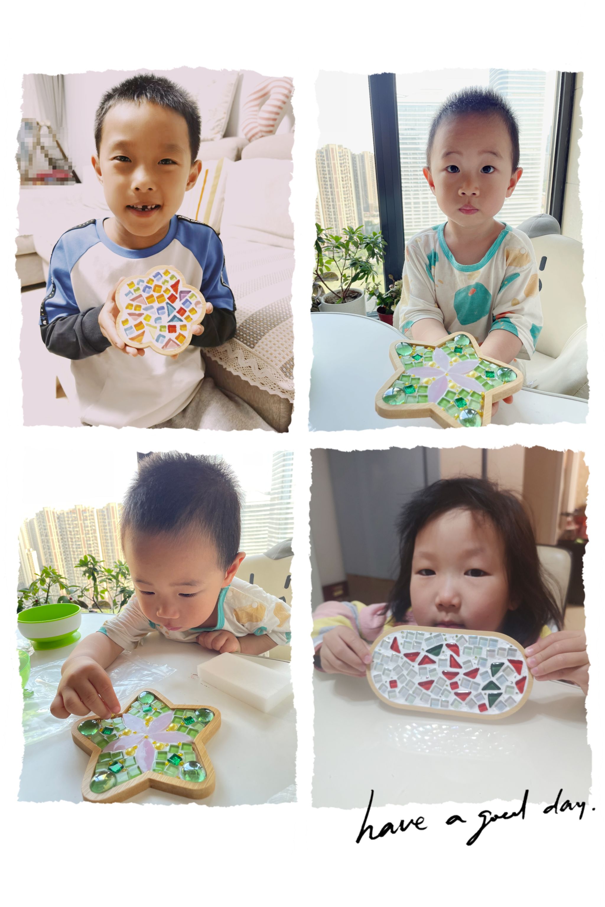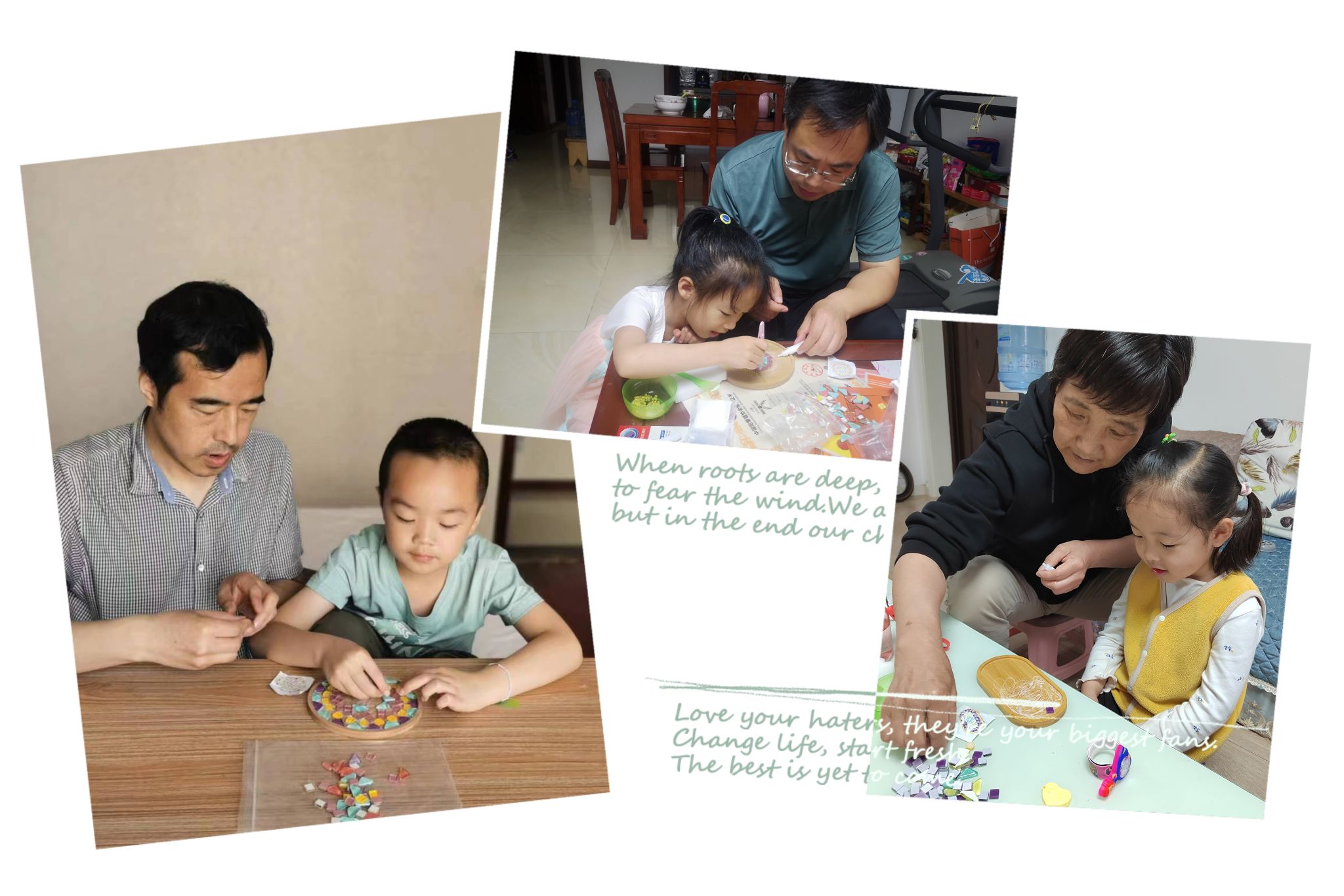 活动以“小手拉大手”的方式,让孩子和家长一起合作完成,通过色彩搭配、涂料填充等步骤,将一个个零散的材料拼成七彩艺术品。