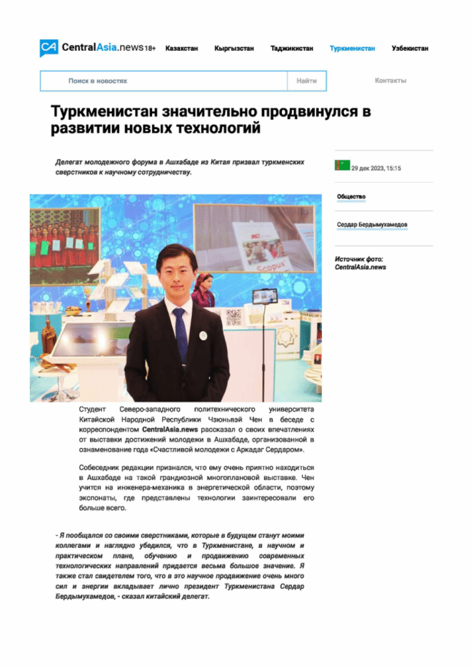 陈俊伟同学接受了国际媒体中亚新闻(CentralAsia.news)记者和来自俄罗斯记者的采访,表达了对来到阿什哈巴德(Ashgabat)这所洁白之城(土库曼语中“阿什哈巴德”的语义)的激动,在现场和土库曼斯坦多所大学学生进行热烈交流的喜悦,希望和同龄人共同推动科学和技术进步的憧憬,并对博览会的整体设计中所体现出的创造性和创新性表达了钦佩和欣赏。陈俊伟同学殷切表达了对希望未来能够继续参与到yl6809永利集团和土库曼斯坦诸所大学在力学、应用科学和工程科学上共同举办的活动中,并继续深入交流这一愿景。