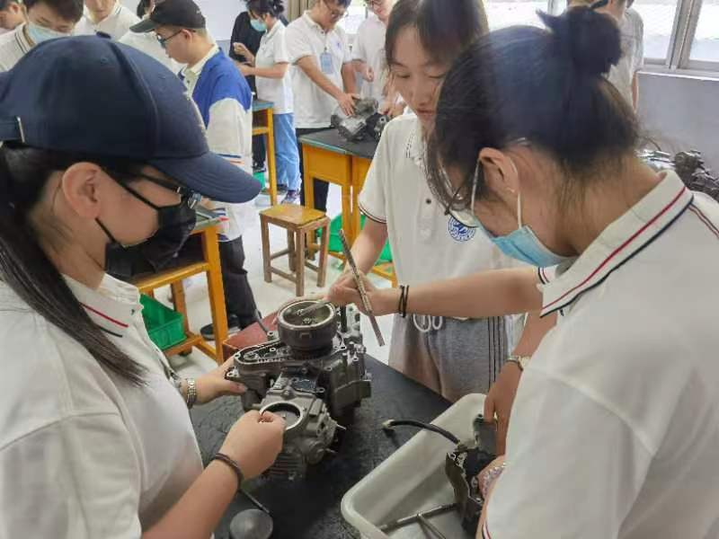 图为实践队员进行拆卸摩托车发动机。于昊玉 摄