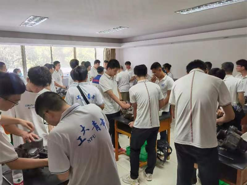 6月30日下午,实践队来到洛阳大学生实训中心,学习了四冲程摩托车发动机的工作原理和构造,详细学习了发动机由机体、曲柄连杆机构、起动机构、离合器和变速机构和配气机构五大机构组成,同时听取了拆装发动机的注意事项。