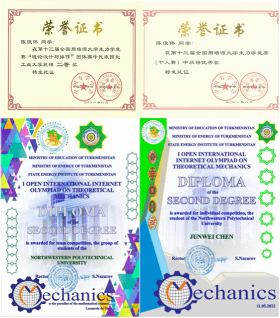 从对力学了解浅薄的小白,到深入掌握相关知识的科班生,力学竞赛的参赛经历见证了他对力学知识的理解由浅入深。在仅学习了理论力学半本书的情况下,他参加周培源大学生力学竞赛,并且在优秀奖中获得了比较靠前的排名;2022年,他在土库曼斯坦理论力学竞赛中获得了团队赛和个人赛双双国际二等奖的成绩;2022年暑期,他与队友通力合作,更是在全国周培源大学生力学竞赛中,代表西工大取得了全国第五名——这一近十年来的最佳成绩。