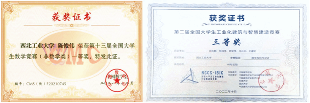除了力学类竞赛以外,他在其他竞赛上也成就满满:全国大学生数学竞赛一等奖、美国大学生数学建模竞赛一等奖,全国工业化制造与智能建筑竞赛三等奖……自己的努力与队友的配合、跨专业的建筑项目协作,一步步地帮助他逐渐成长。
