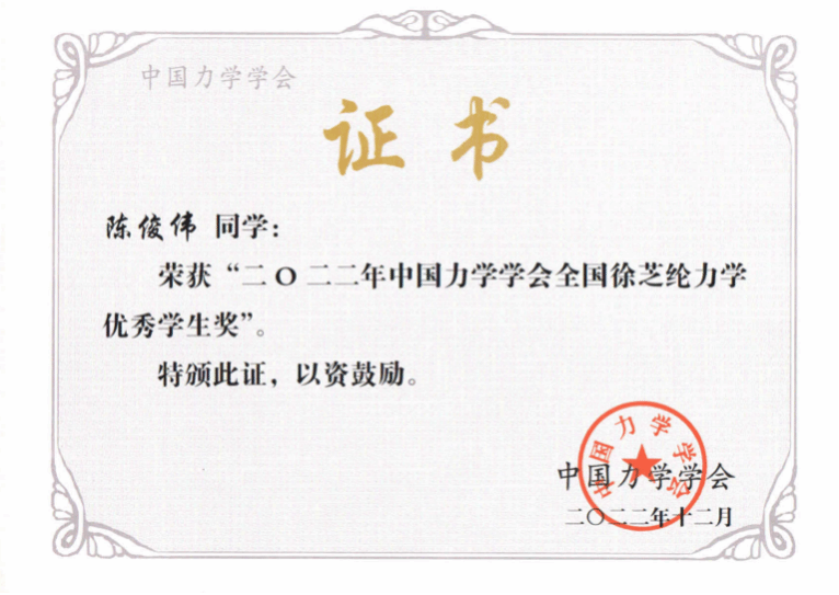 经过陕西省力学学会专家评审推荐,我院2020级本科生陈俊伟荣获“2022年中国力学学会徐芝纶力学优秀学生奖”。