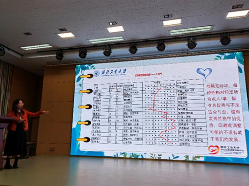 本次新生心理适应专题讲座中,狄老师首先向同学们介绍了西工大学生心理健康教育中心的主要工作以及各位老师的联系方式,并向同学们表示:所有老师都十分欢迎同学们预约心理服务,老师们会全力帮助同学们答疑解惑、提供心理咨询服务。随后,狄老师围绕9月份开展的新生心理测评,分析SCL-90、16PF、家庭功能评定量表、领悟社会支持量表的测评结果,帮助同学们全面客观科学地认识自己、提高心理保健意识,并告诉大家:要以平和心态看待心理测评结果,测试只表示同学们的现实心理状况,不能随意给自己“扣帽子”、“贴标签”。同时,狄老师也邀请同学们进行后续的校园生活适应访谈,希望进一步了解大家入校后的学习、生活、心理状况。最后,狄老师和同学们一起讨论了大学生初入大学的各类常见情绪,并通过生动的故事、有趣的情境,引导同学们通过正确的方法调节消极心理状态,在面对不良情绪时保持一个良好的心态,以乐观向上的态度去面对新的大学生活、繁忙的学习和工作。