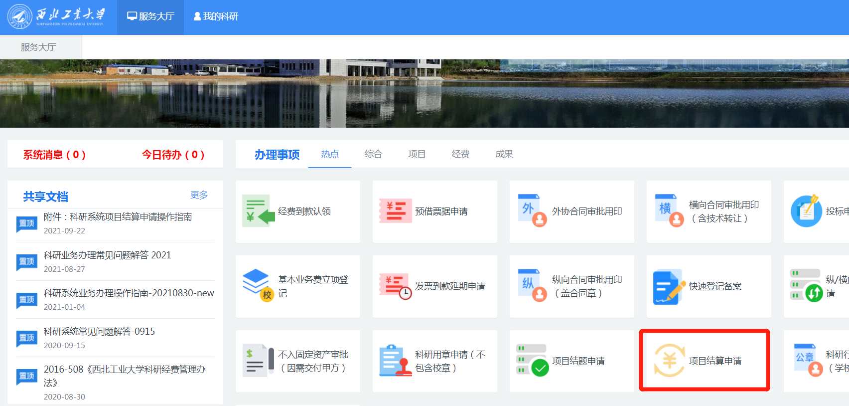1、办理地址:翱翔门户——科研系统——项目结算申请