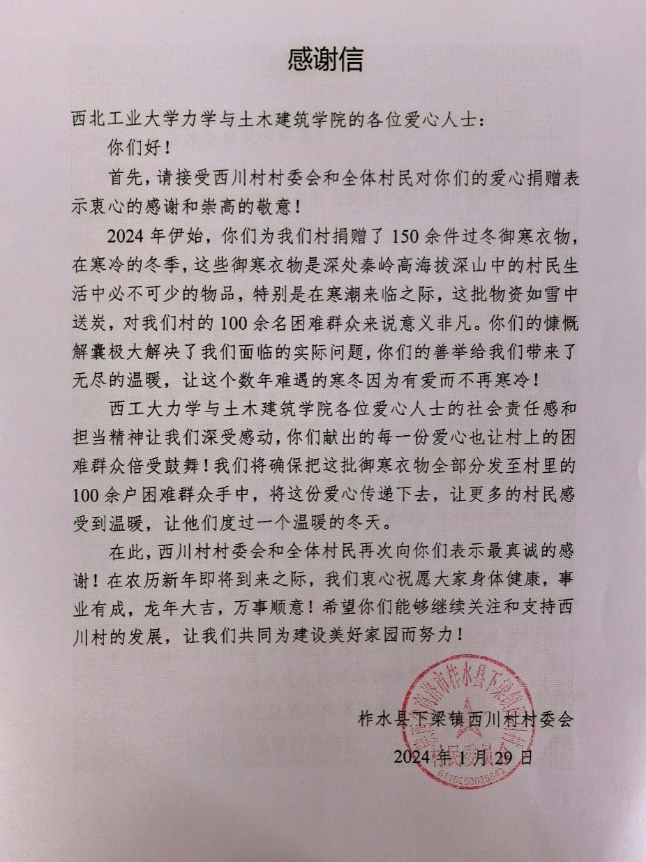 近日,力学与土木建筑学院收到柞水县下梁镇西川村对学院捐赠衣物的感谢信,向参与捐赠活动的老师表示衷心感谢和崇高敬意。