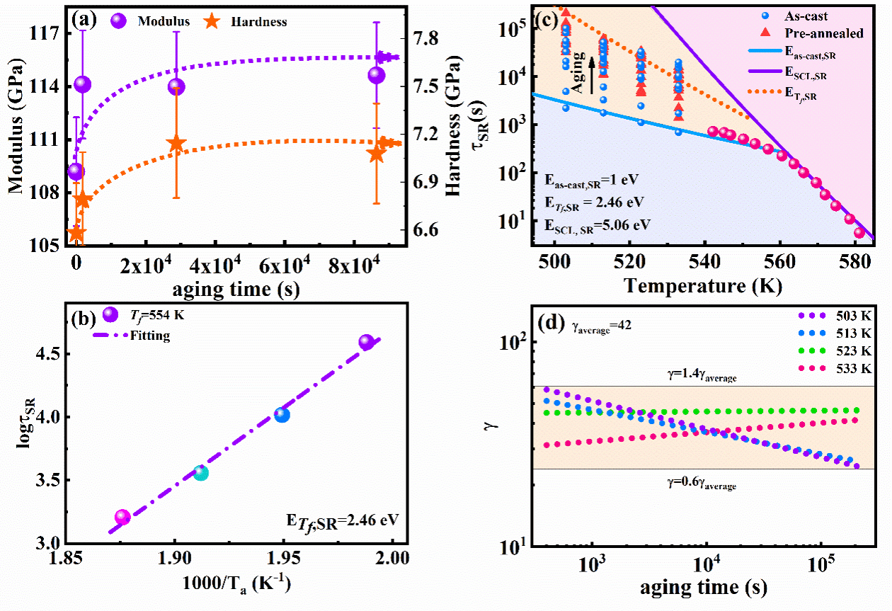 研究团队首次详细探索了Pd20Pt20Cu20Ni20P20高熵非晶合金结构动力学和热动力学特性的内禀性关联,如图2所示。随物理时效增加,其应力松弛特性明显地与焓平衡动力学相关联。这与传统上仅将物理老化与β弛豫相关联的观点不同,研究团队发现激活能随物理老化时间发生变化,并展现出广泛的激活能分布。应力松弛弛豫时间与焓弛豫时间及微纳力学特性(杨氏模量和硬度等)的平衡速率呈正比。值得注意的是,高熵非晶合金动态非均匀性和纳米压痕测得的微观结构非均匀性呈现相反的趋势。通常,玻璃动态性能与其空间结构非均匀性质相关,然而,该研究观察到在空间结构更加均匀化的同时动态非均匀性增加。这种动态非均匀性行为可能为老化初期阶段的一个特征。动态非均匀性来源不仅与具有不同松弛时间尺度空间区域的分布有关,也与不同类型原子微观重排相关松弛模式有关。这些松弛模式可以通过力学及物理机制的类型来区分,例如剪切转变区域或类似原子团运动,也可以通过合作性的程度来区分。研究发现,动态非均匀性变化与这些机制时间尺度及其对总体松弛相对贡献与老化演变过程有关。此外,应力松弛动力学行为比焓弛豫表现出更显著变化,这表明应力松弛动力学行为为更敏感的性质,可用于表征高熵非晶合金的结构状态。