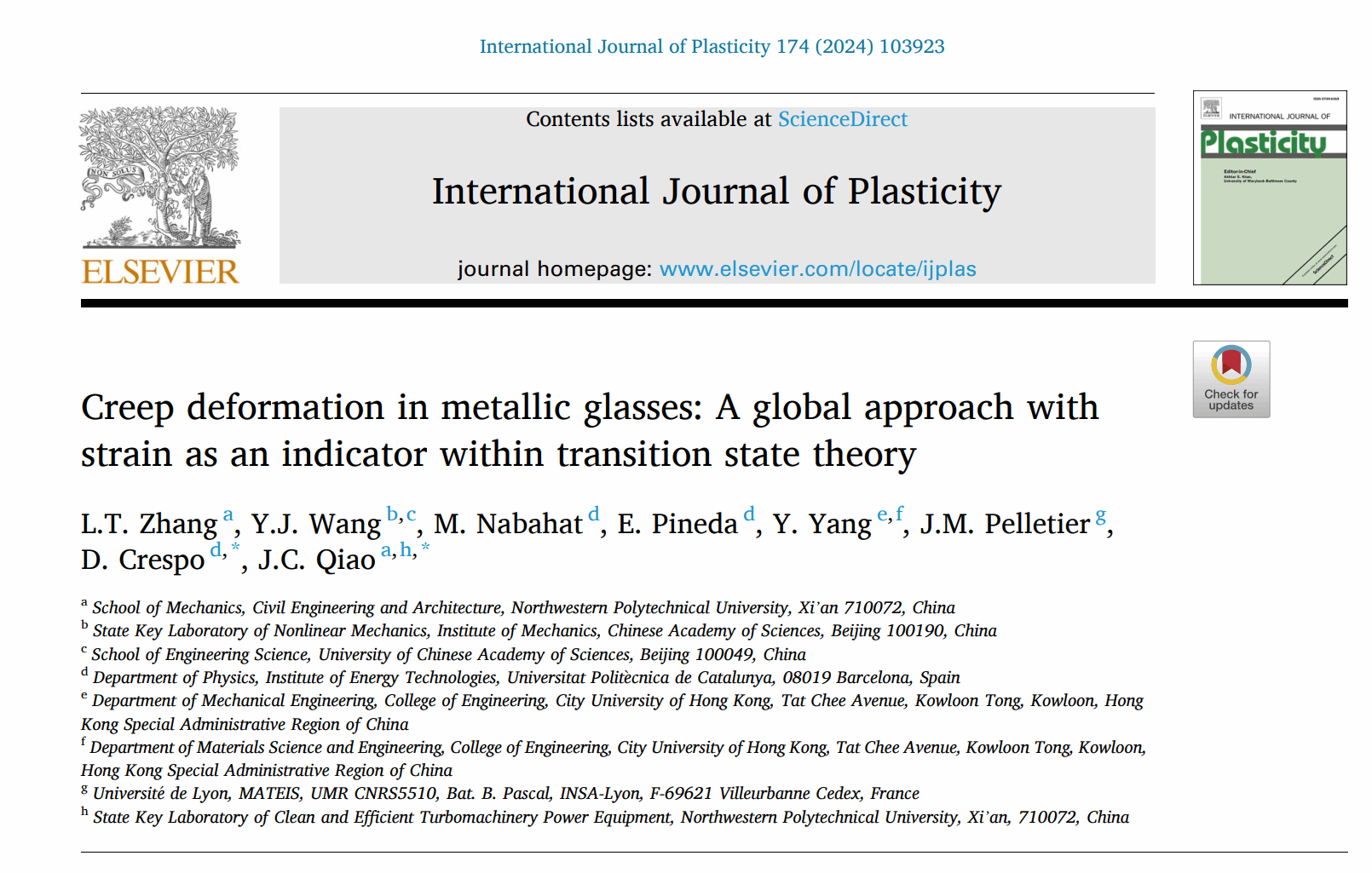 [1] L.T. Zhang, Y.J. Wang, M. Nabahat, E. Pineda, Y. Yang, J.M. Pelletier, D. Crespo*, J.C. Qiao*, Creep deformation in metallic glasses: A global approach with strain as an indicator within transition state theory, International Journal of Plasticity. 174 (2024) 103923. (https://doi.org/10.1016/j.ijplas.2024.103923)