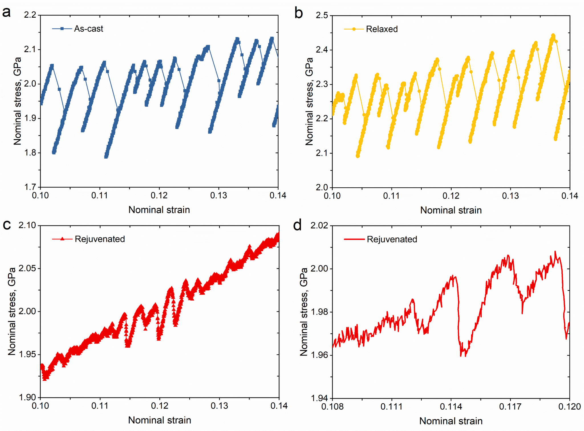 主要成果四:本研究借助纳米压痕和微柱压缩探究了不同能量状态非晶合金锯齿流变转变和剪切带扩展机制(如图4所示)。通过锯齿滑移动力学统计,获得了应力弛豫持续时间和弛豫速率,并结合剪切带特征,发现回春态样品变形是通过小滑移进行。从缩放指数、锯齿持续时间和应力弛豫速率的角度,建立了剪切转变区的局部激活与宏观剪切带的产生之间的联系。本文揭示了非晶合金从结构弛豫到回春中锯齿滑移转变机制,有助于加深对无序固体塑性的理解。