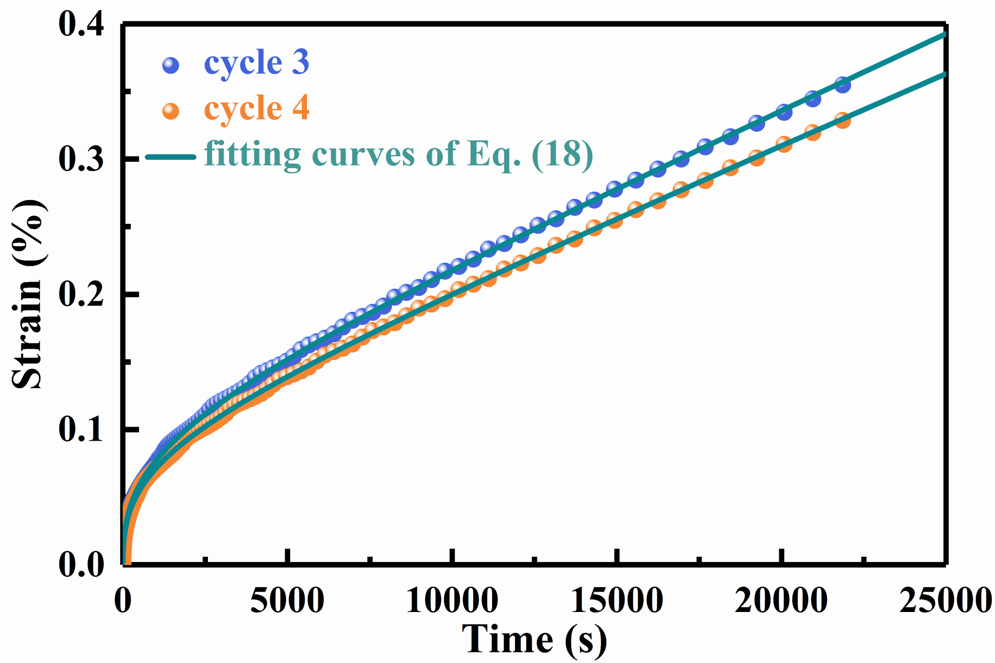 图3 不同循环次数下非晶合金蠕变曲线与拟合结果