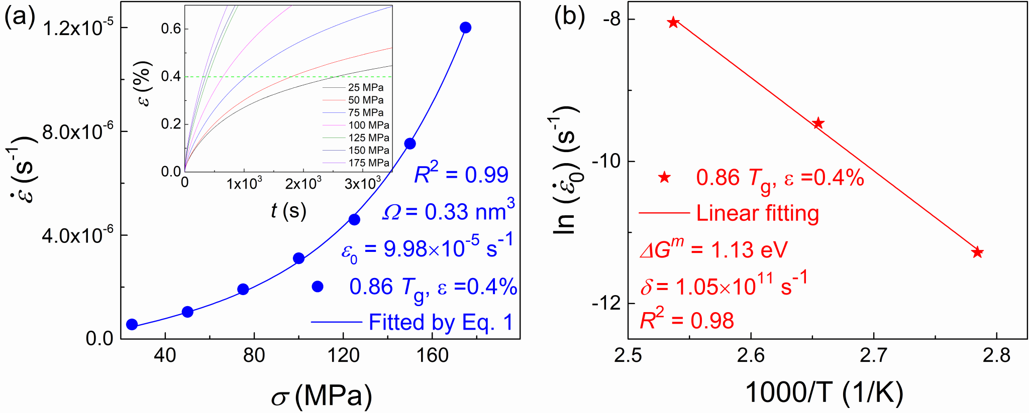 主要成果三:将分级关联的原子运动视为非晶合金中的基本运动模式,解释了在循环加载条件下蠕变应变速率响应中从三个区域向两个区域转变的现象。研究结果表明,蠕变响应涉及两种基本变形机制,其特点是具有不同的原子运动关联性(如图3所示)。新的蠕变机制解决了准点缺陷理论在描述长时间蠕变方面的局限性。此外,在广泛的应力和温度条件下研究了热效应和力效应对上述变形机制的影响。