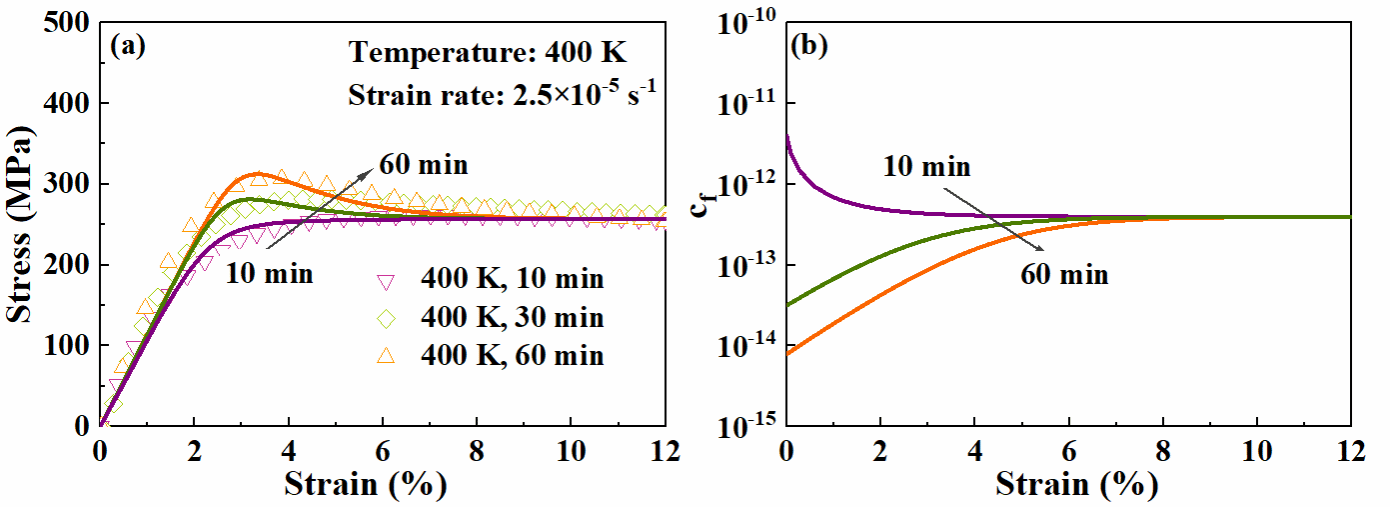 主要成果二:由于其热力学非平衡性质,在考虑结构状态演化的同时描述非弹性变形相当困难。我们通过将结构状态变化的参数纳入传统变形理论来解决这一挑战。通过分析不同变形条件下单轴拉伸及应力松弛过程中的缺陷浓度演化,我们在自由体积理论框架内描述了相关实验结果,有效地分离了老化和回春两个竞争过程对变形的贡献(如图2所示)。