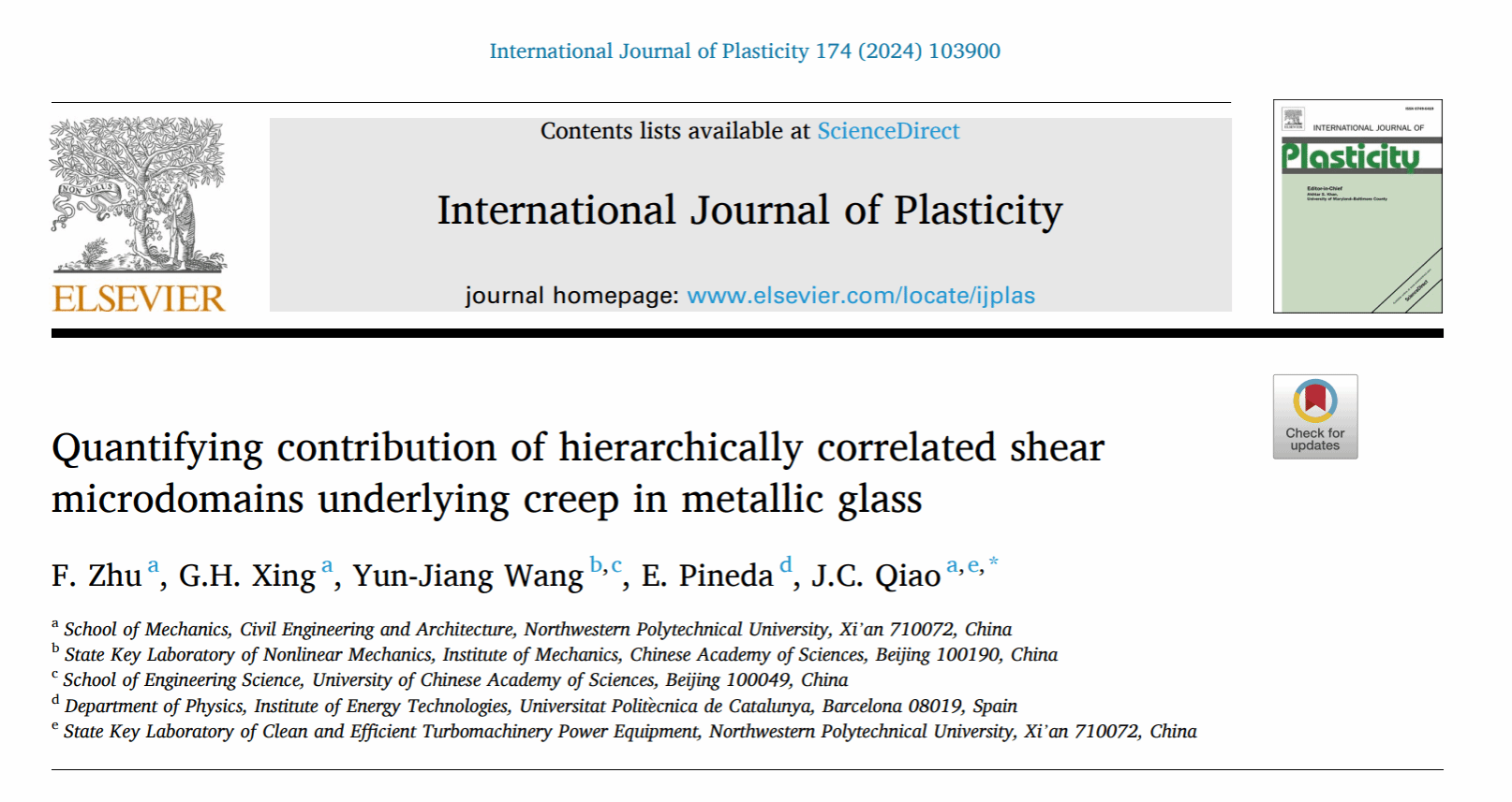 [3] F. Zhu, G.H. Xing, Yun-Jiang Wang, E. Pineda, J.C. Qiao*, Quantifying contribution of hierarchically correlated shear microdomains underlying creep in metallic glass, International Journal of Plasticity. 174 (2024) 103900. (https://doi.org/10.1016/j.ijplas.2024.103900)