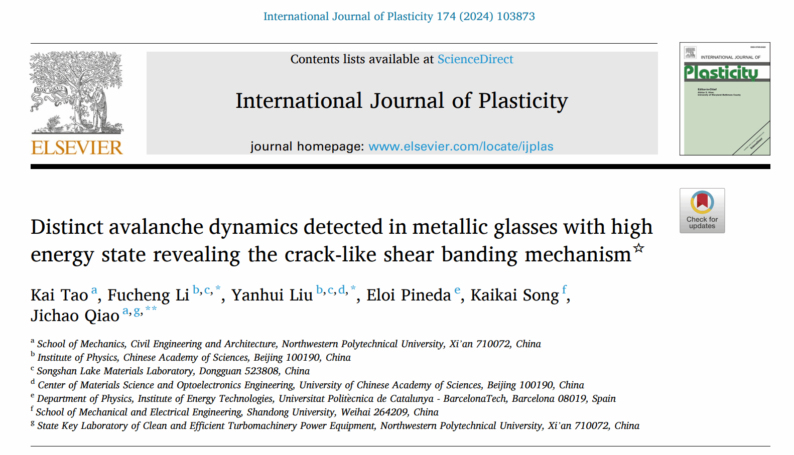 [4] K. Tao, F.C. Li*, Y.H. Liu*, E. Pineda, K.K. Song, J.C. Qiao*, Distinct avalanche dynamics detected in metallic glasses with high energy state revealing the crack-like shear banding mechanism, International Journal of Plasticity. 174 (2024) 103873. (https://doi.org/10.1016/j.ijplas.2023.103873)
