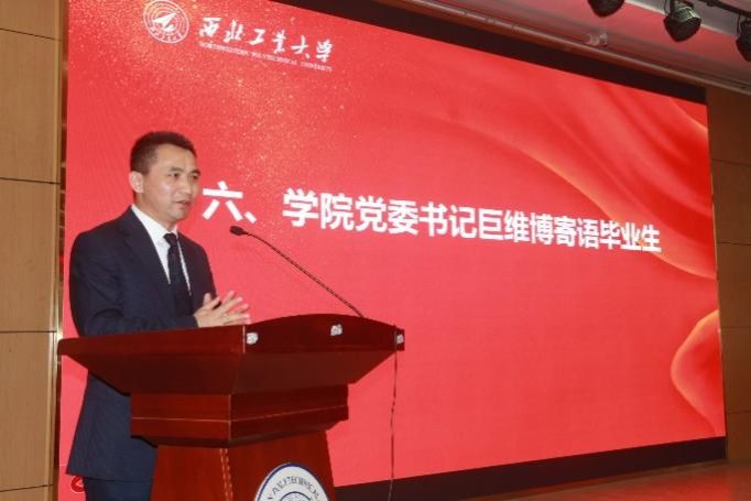 学院党委书记巨维博为毕业生寄语,他希望同学们勤勤恳恳,历练心志,在平凡的工作岗位上建功立业;希望同学们勤于学习,勇于实践,不断提高自身综合能力,努力成才;希望同学们无愧青春,不负韶华,带着母校的殷切期望、师长的深情嘱咐、亲友的诚挚关怀,始终秉承西工大精神。