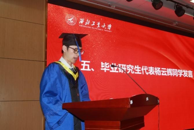 随后,毕业研究生代表杨云辉同学发言,他首先向学院和各位老师表达了自己的感激之情,然后向大家分享了自己从本科到研究生八年工大求学路上的所见所闻所感,并表示会用自己所学的专业知识和技能回报学校和学院,服务社会,奉献社会。