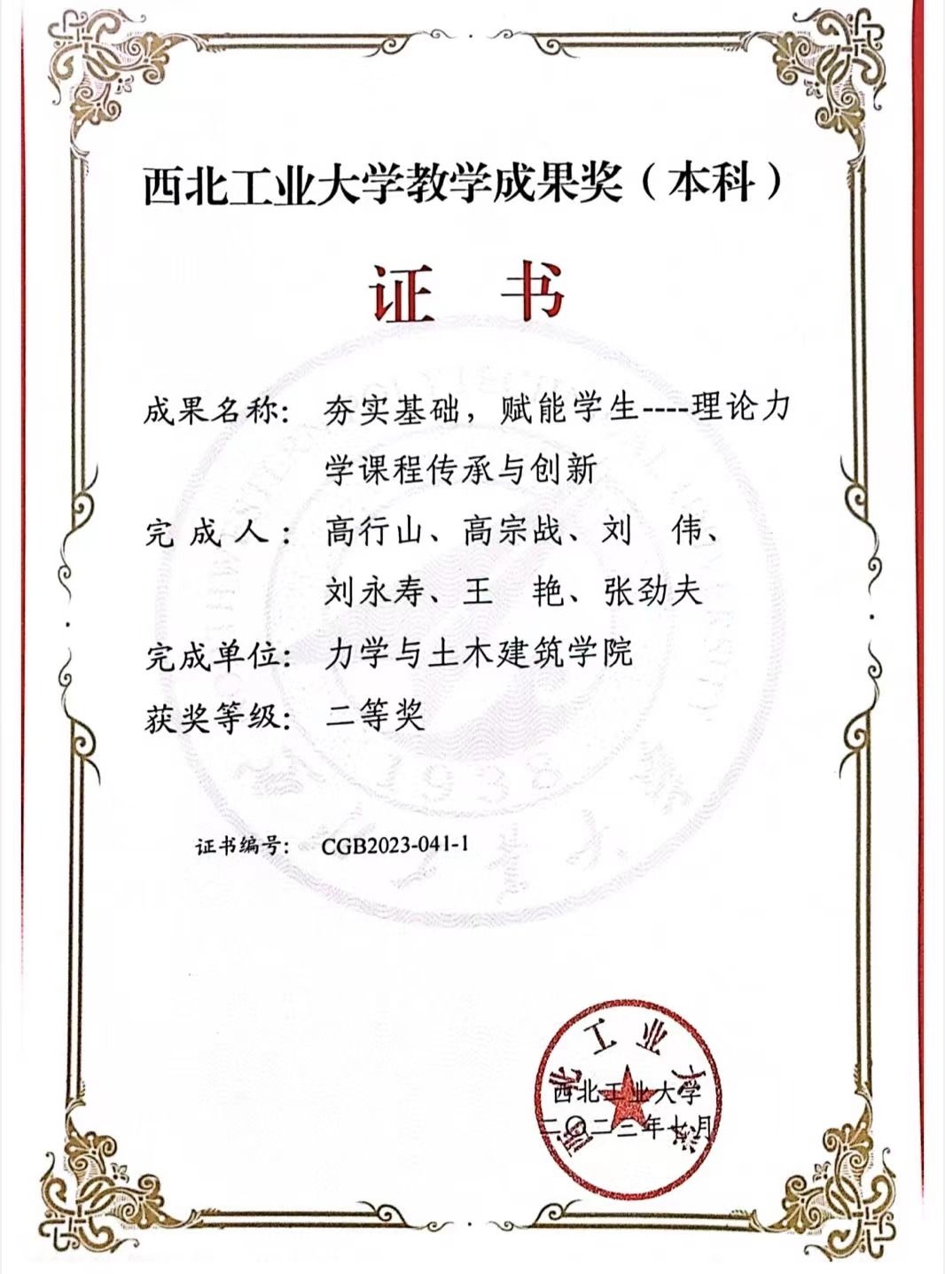 教学成果突出。团队先后参与获得国家级教学成果一等奖1项、二等奖2项、陕西省教学成果奖3项。团队结合优质的线上资源开展线上线下融合的教学模式改革。2020年首批国家级线上一流课程“理论力学”,2020年首批上线中国大学MOOC网国际平台的“Engineering Mechanics”英文在线开放课程;2021年获批“理论力学”陕西省线上-线下混合一流课程;2020年“Engineering Mechanics”成为首批登陆爱课程国际平台的全英文慕课;2023年学堂在线“理论力学A”在线开放;2021年开发《理论力学试题库与出题系统》。团队近3年主持陕西省、西北工业大教学改革项目20余项,发表教育教学论文20余篇,团队教师在全国性教学会议上做大会报告50余人次。