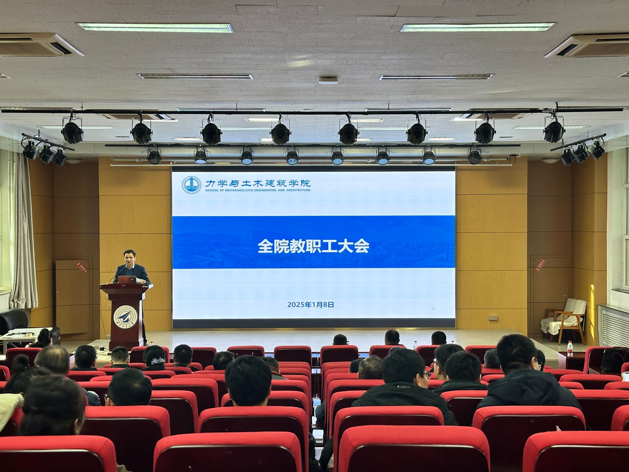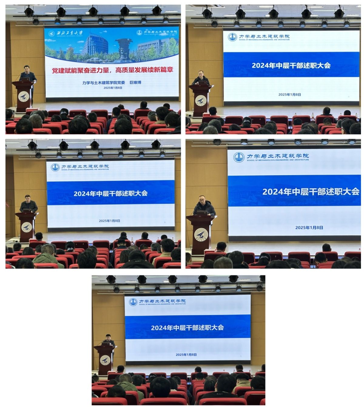 1月8日下午,力学与土木建筑学院在学院报告厅召开了2024年度中层干部述职暨全院教职工大会。党委组织部工作人员、学院全体教职工和学生代表参加了会议。会议由学院党委书记巨维博主持。