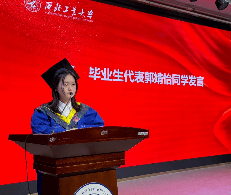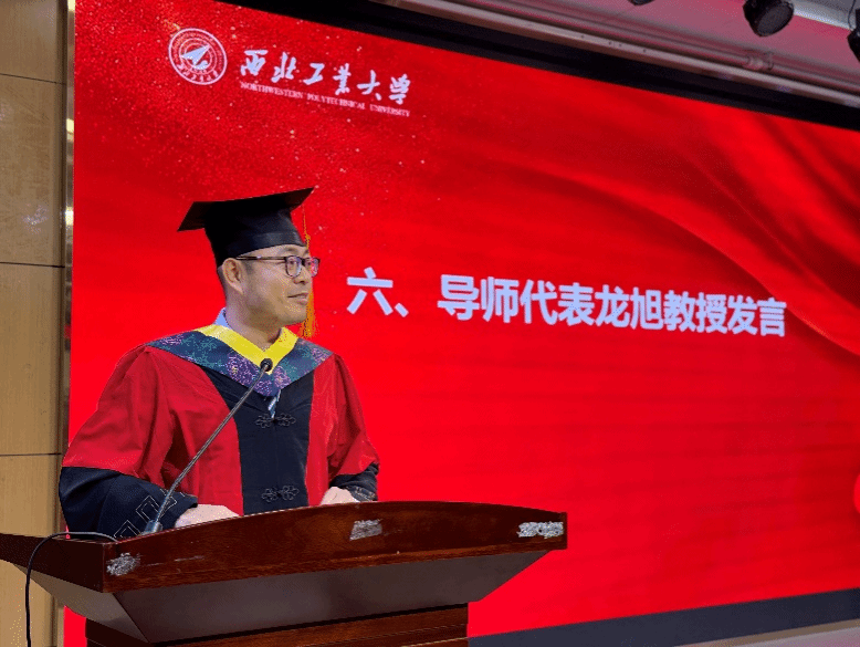 随后,研究生导师代表龙旭教授发言,龙旭老师向大家送出了诚挚的祝福,希望各位同学在未来的道路上能够继续牢记作为西工大人的使命,坚守学术初心、坚守务实品格、坚守家国情怀。
