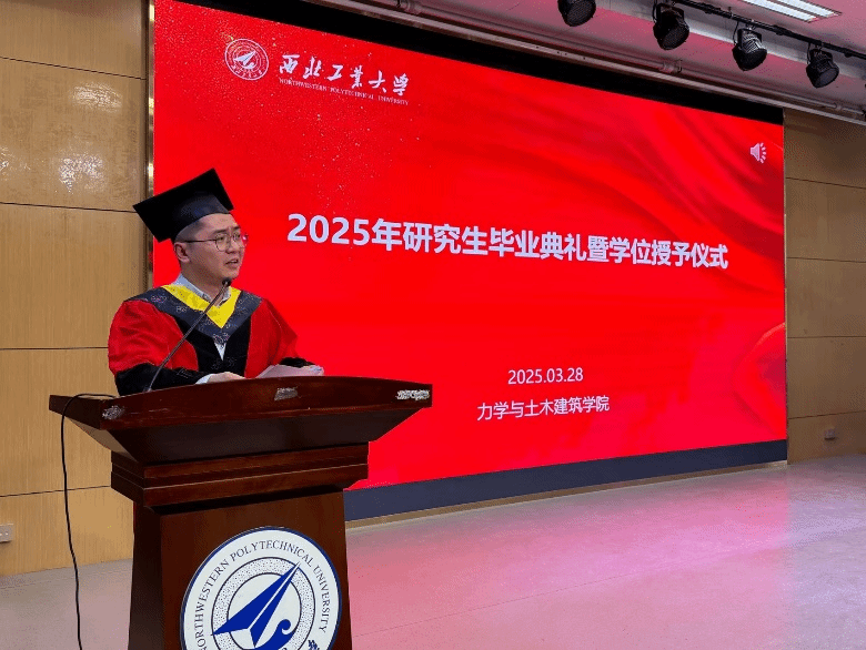 李栋院长在毕业致辞中对全体毕业生提出殷切期望:第一,秉持踏实肯干的作风,在基层岗位中锤炼意志品质,用专业能力创造社会价值;第二,树立终身学习理念,注重理论与实践结合,持续提升解决复杂工程问题的能力;第三,牢记“公诚勇毅”校训,将师长教诲、同窗情谊转化为前进动力,在新时代征程中传承西工大人的责任担当与家国情怀。