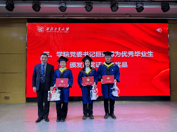 接下来,院长李栋宣读了学位授予名单和优秀毕业生名单,党委书记巨维博为优秀毕业生颁发获奖证书和奖品,并与优秀毕业生合影留念。