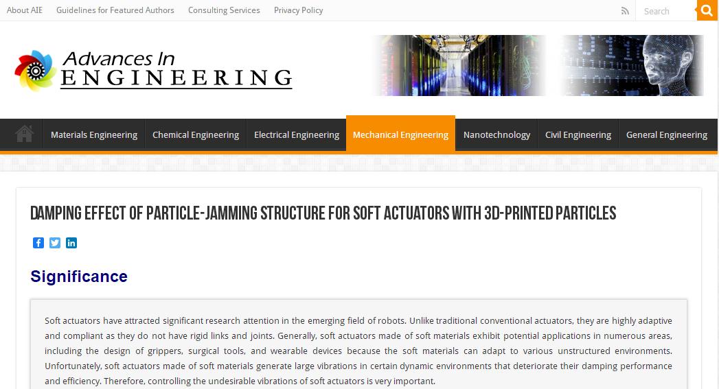 近日,yl6809永利集团复杂系统动力学与控制工信部重点实验室邓子辰教授研究团队发表在工程领域国际著名学术期刊Smart Materials and Structures上的论文“Damping effect of particle-jamming structure for soft actuators with 3D-printed particles”被国际著名科技机构Advances In Engineering (AIE)遴选为关键科学文章,并进行了专题报道。