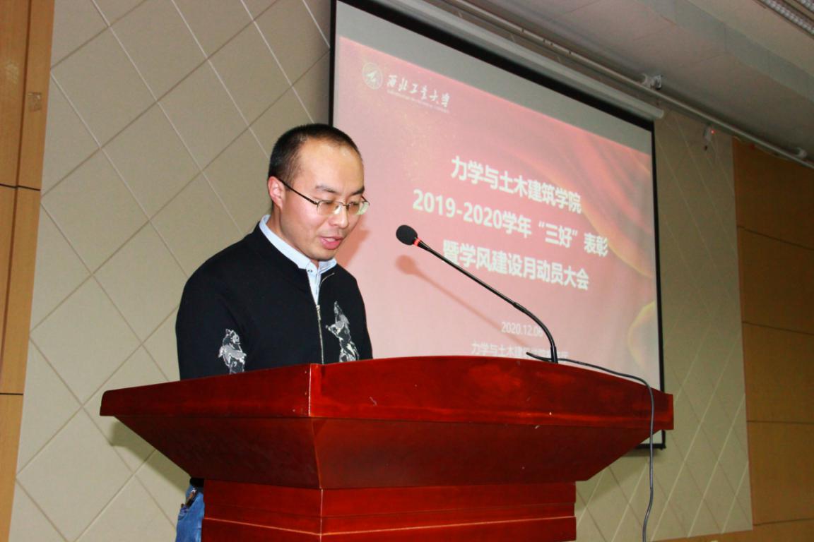 2020年12月6日晚18:30,力学与土木建筑学院2019-2020学年“三好”表彰暨学风建设月动员大会于学院楼学术报告厅举行。本次大会由学院党委副书记乔吉超主持,院长李栋教授、学院党委副书记(主持工作)巨维博同志、副院长张凯、院长助理罗向阳,以及全体辅导员及部分班主任出席。