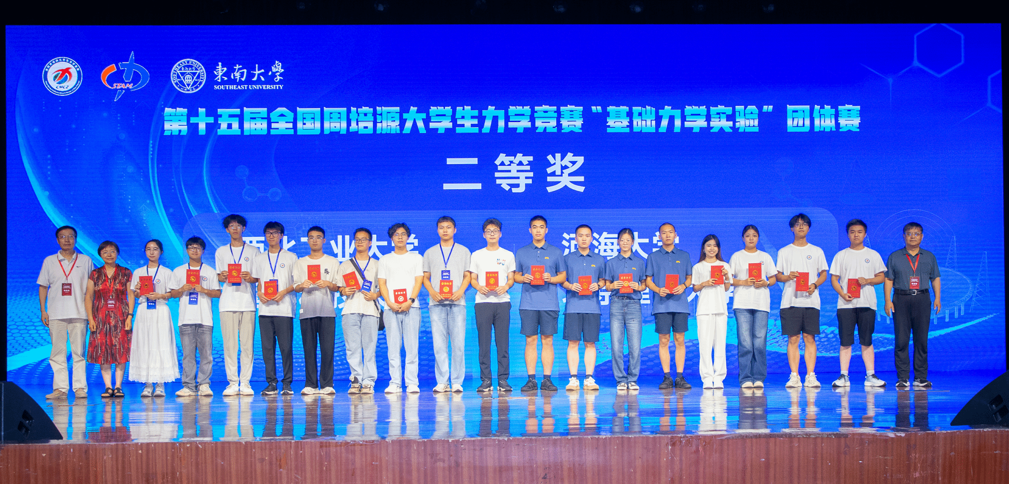 2025年7月12-17日,第十五届全国周培源大学生力学竞赛团体赛分别在南京东南大学和长沙国防科技大学举行。在全体指导教师和参赛同学的共同努力下,由我校大学生力学创新实践基地组织和指导的参赛队分别获得“基础力学实验”团体赛二等奖和“理论设计与操作”团体赛三等奖,并在2025年中国力学大会上受到大会颁奖。