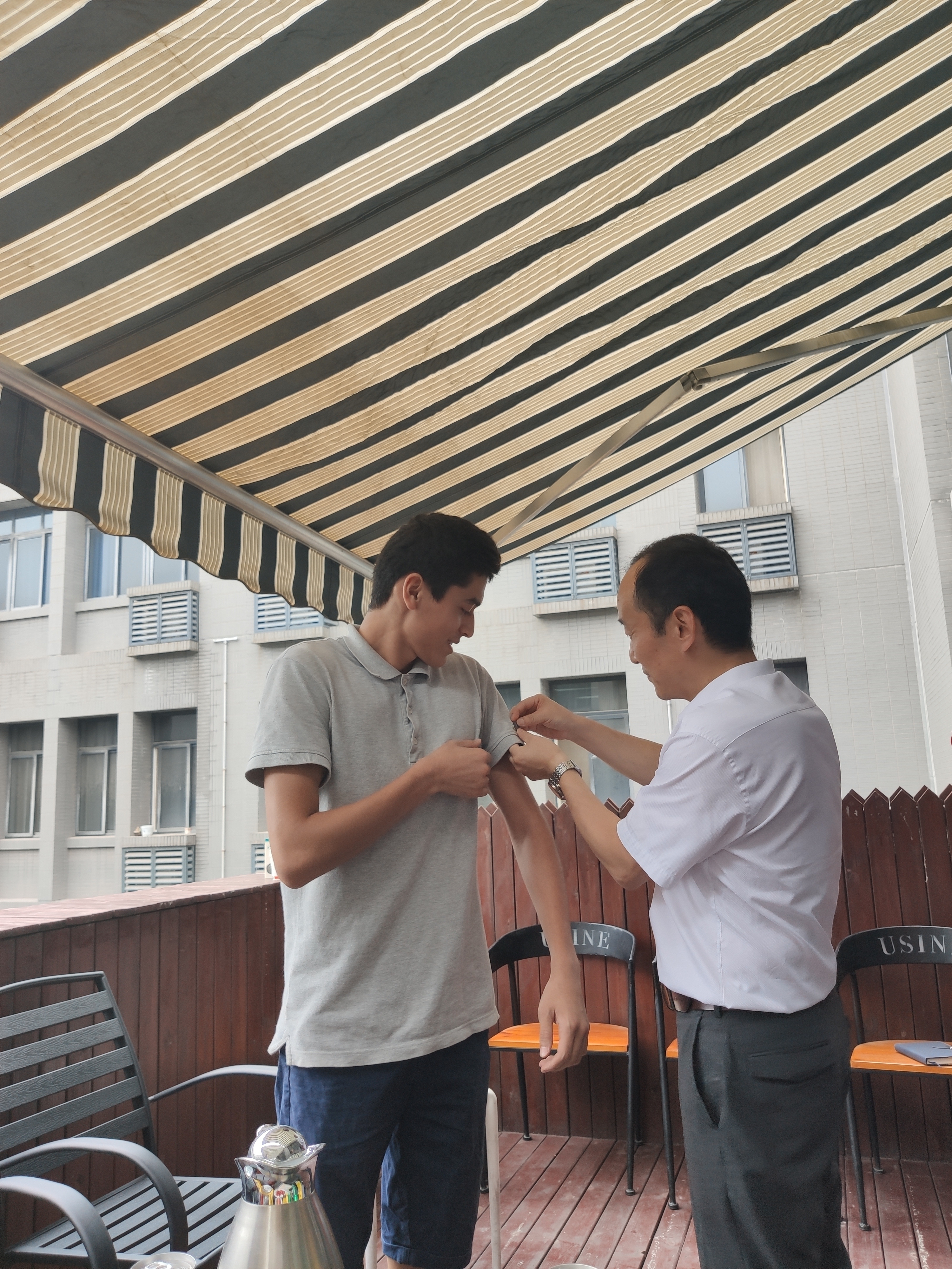 同学们分别做了自我介绍,与老师们进行轻松交流。书记高大力和院长李栋鼓励同学们积极学习汉语和中国文化,充分利用学校各项资源,争取回国后成为具有国际视野的优秀人才。随后,院长李栋亲自为每位同学佩戴了院徽,将见面会推向了高潮。“It’s our honor.”同学们都纷纷表示。最后,院长助理龙旭对前期留学生提出的问题做了细致的反馈,并就部分学生关于实习实践、课程管理等问题进行了记录和解答。临近暑期,希望同学们做好自我管理,安全出行。
