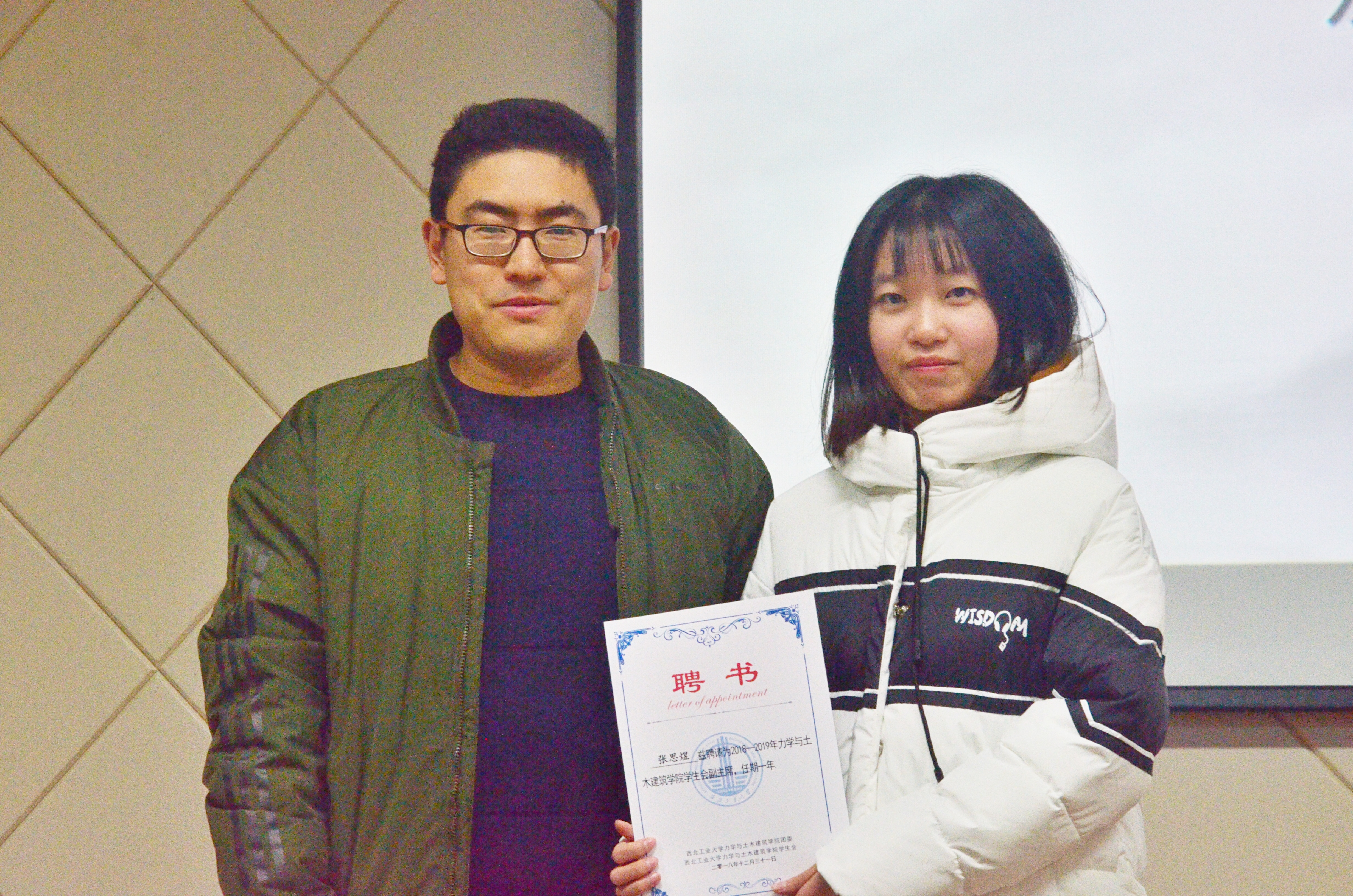 力学与土木建筑学院学生会现有7个部门近百余人,他们朝气蓬勃,奋发向上,营造了良好的工作学习环境。作为学生会中的骨干成员,各部门部长同学依次上台发言,总结本部门本学期工作,谈论收获,展望未来。办公室的韦海璐同学在繁杂的统筹工作中学会了化繁为简,收获了协调能力;体育部的张书铖同学在操办体育赛事中能够及时发现问题,保证了赛事的平稳进行;网宣部的周煜堂同学经常为推送新闻而工作到很晚,但是看到点击率的攀升依然兴奋不已;过去的一个学期里,得益于每一位辛勤付出的同学,学院学生会的工作平稳推进,取得了不错的成绩。为表彰各位同学对学院做出的贡献,侯恬、尉亚军老师为他们颁发了学院聘书,激励他们在将来的学习和工作中能够提升自我,更上台阶。