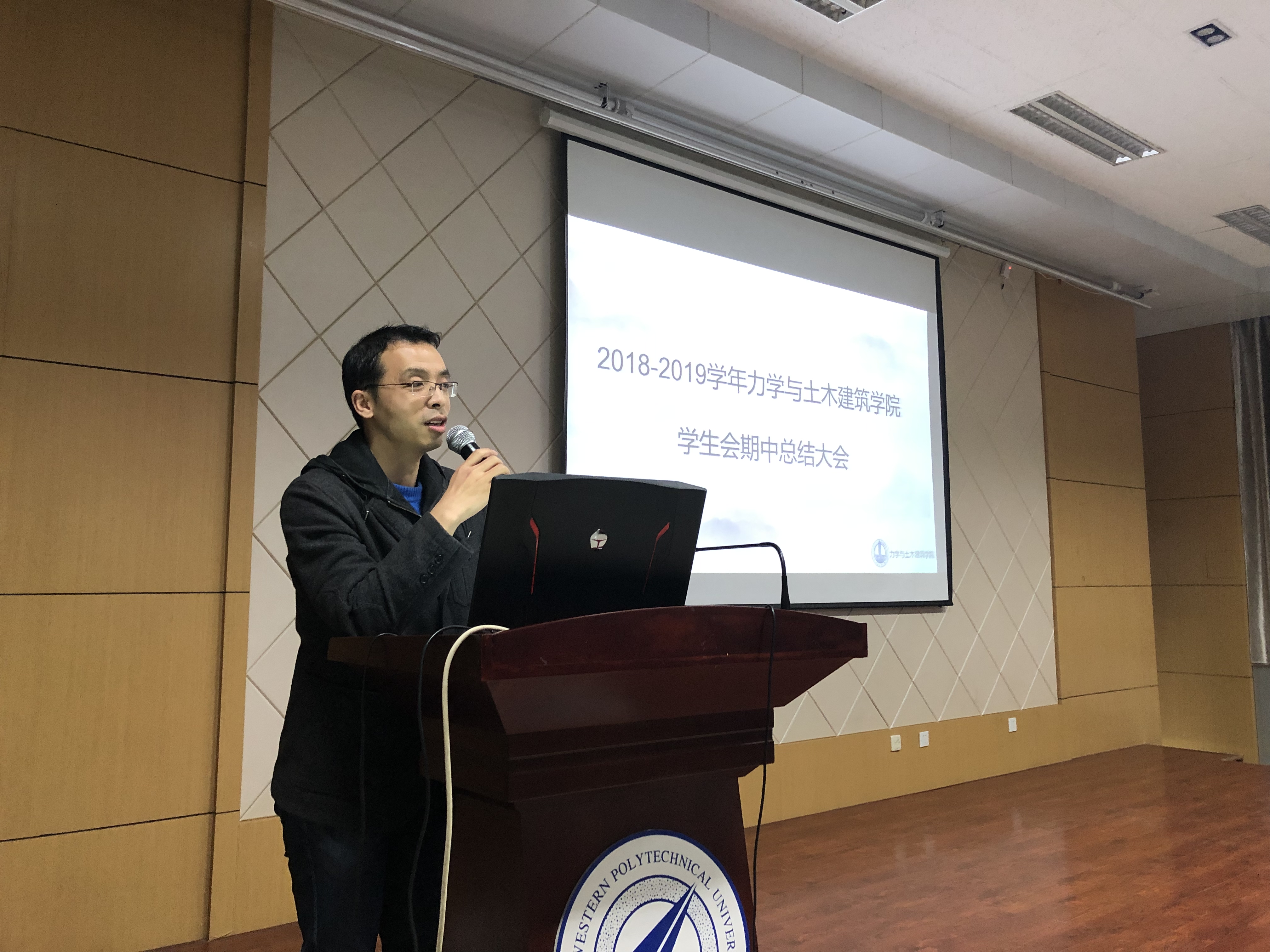 西工大新闻网1月4日电(侯恬) “要紧跟时代潮流,做有‘全球胜任力’的新时代大学生”。1月3日晚,力学与土木建筑学院学生会中期总结大会在学院楼报告厅举行,总结学生会本学期以来的工作,并对下学期做出展望。学院党委副书记王凡华、学院团委书记侯恬、本科生辅导员尉亚军老师参加了会议。会议由学生会主席杨云辉同学主持。