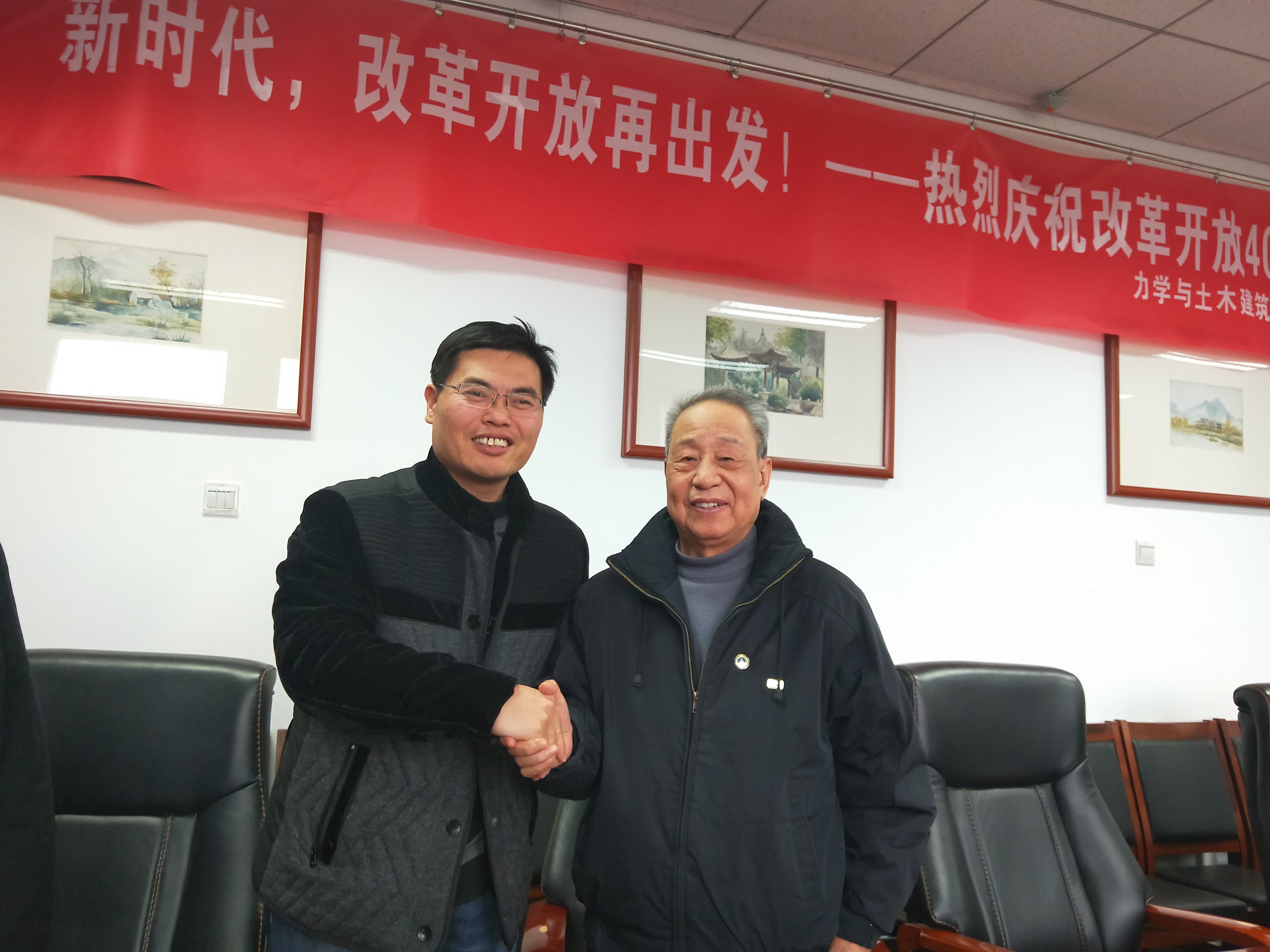 首先,高大力致欢迎辞,对老教师一直以来为学院发展做出的贡献表示衷心感谢。随后李栋就近几年学院学科、科研、教学等方面的发展进行了详细介绍,并对2018年学院的重点工作进行了全面汇报。老教师对学院近年来取得的成绩深感欣慰,并且纷纷建言献策,给出了很多有利于学院发展的宝贵意见。李栋表示老教师们为教育事业付出了巨大贡献,他们的精神与经验对于学院发展是不可或缺的珍贵财富,老教师不但是学院成长的见证人,更是我们要学习的榜样。最后,李栋为每一位老教师佩戴院徽,并给予亲切的问候。